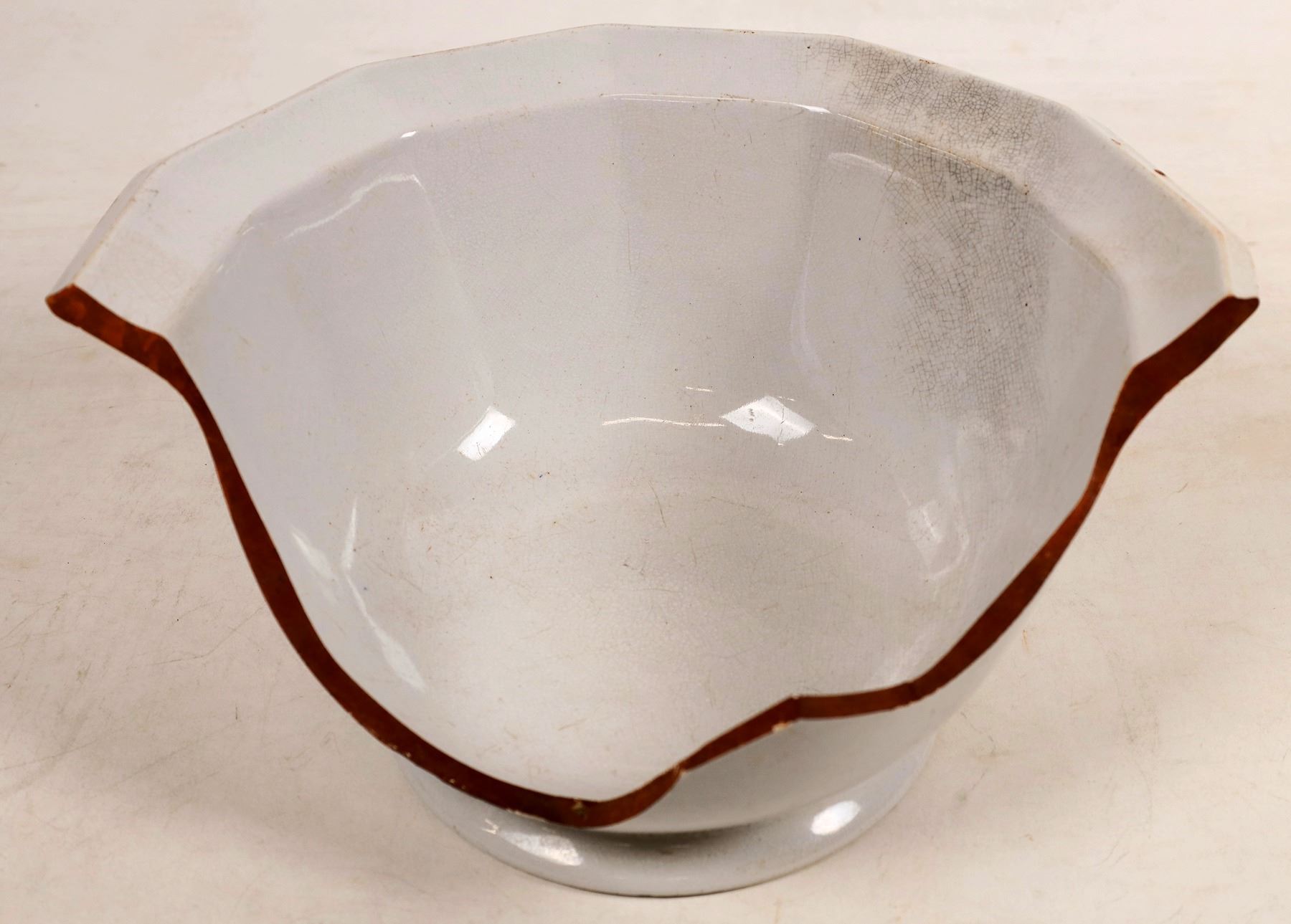 Dubbed the "Celebrity Wash Basin" because it was photographed so frequently by Nemo the underwater ROV. It sat right next to the Gold Room, so it appears in many images. Be sure to look at the 3-D image of this wash basin next to a box of gold coins, in the 3D Technologies section. This broken but distinctively shaped wash basin is also clearly visible in the debris field on page 102 of the Holabird December, 2002 SS Central America catalog. Originally 12 sided, 5 full and 2 partial sides remain. Hallmark on the base shows the British royal seal with // IRONSTONE CHINA / J.F. // beneath it. This refers to J. Fernyhough, who was a china/ironstone manufacturer in Staffordshire, in partnership with J. Adams and S. Hartshorne, until October 1853. (10/4/1853 Liverpool Mercury, and 10/7/1853 Coventry Standard). This piece may have been purchased as part of the initial outfitting of the ship for its maiden voyage in October 1853 as the S.S. George Law, the original name for the S.S. Central America. Lip is 12.75" across the top, base 6.75". 1" lip chip, mostly underneath the lip. 1.25" hairline crack inside of basin on a broken side. Rust stains the broken edges of this piece, evidence that the damage occurred long ago, during the shipwreck.