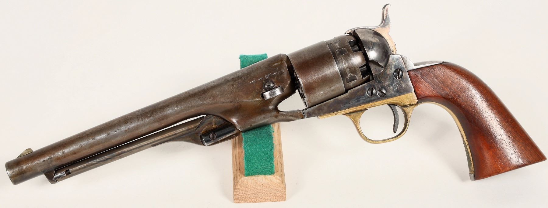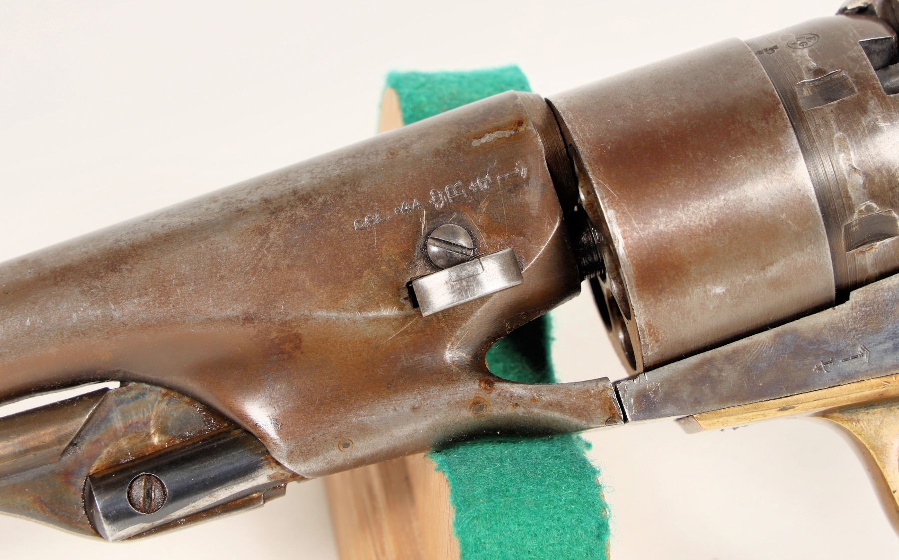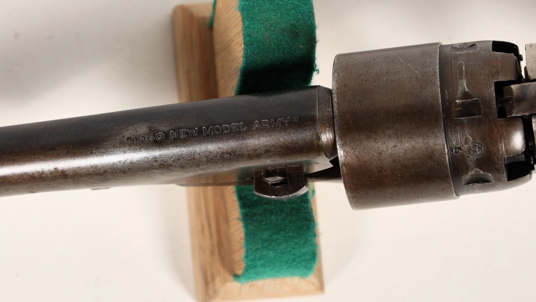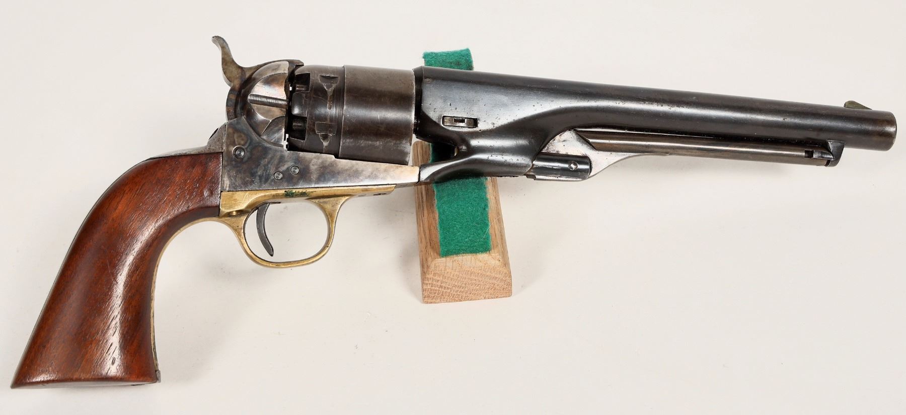 This is a "1860 NEW MODEL ARMY" revolver made in Belgium by Centennial Arms in 1960. It is S/N 791 with all matching numbers on an 8 in. barrel. There is no battle scene engraved on the cylinder which is correct for low serial number guns. It has a three screw frame with a cutaway for stock and "MADE IN BELGIUM" on the bottom of the grip strap. Bluing is complete on one side of the gun. On the left side of the bun bluing is absent and replaced with a patination. The wedge fits poorly. With Belgian proof marks on the barrel, frame, and cylinder. .44 caliber markings. Machined at .442 in. About 40 % bluing left, some external pitting on the barrel, handling marks on the grips. No FFL required. Please see photos for details.