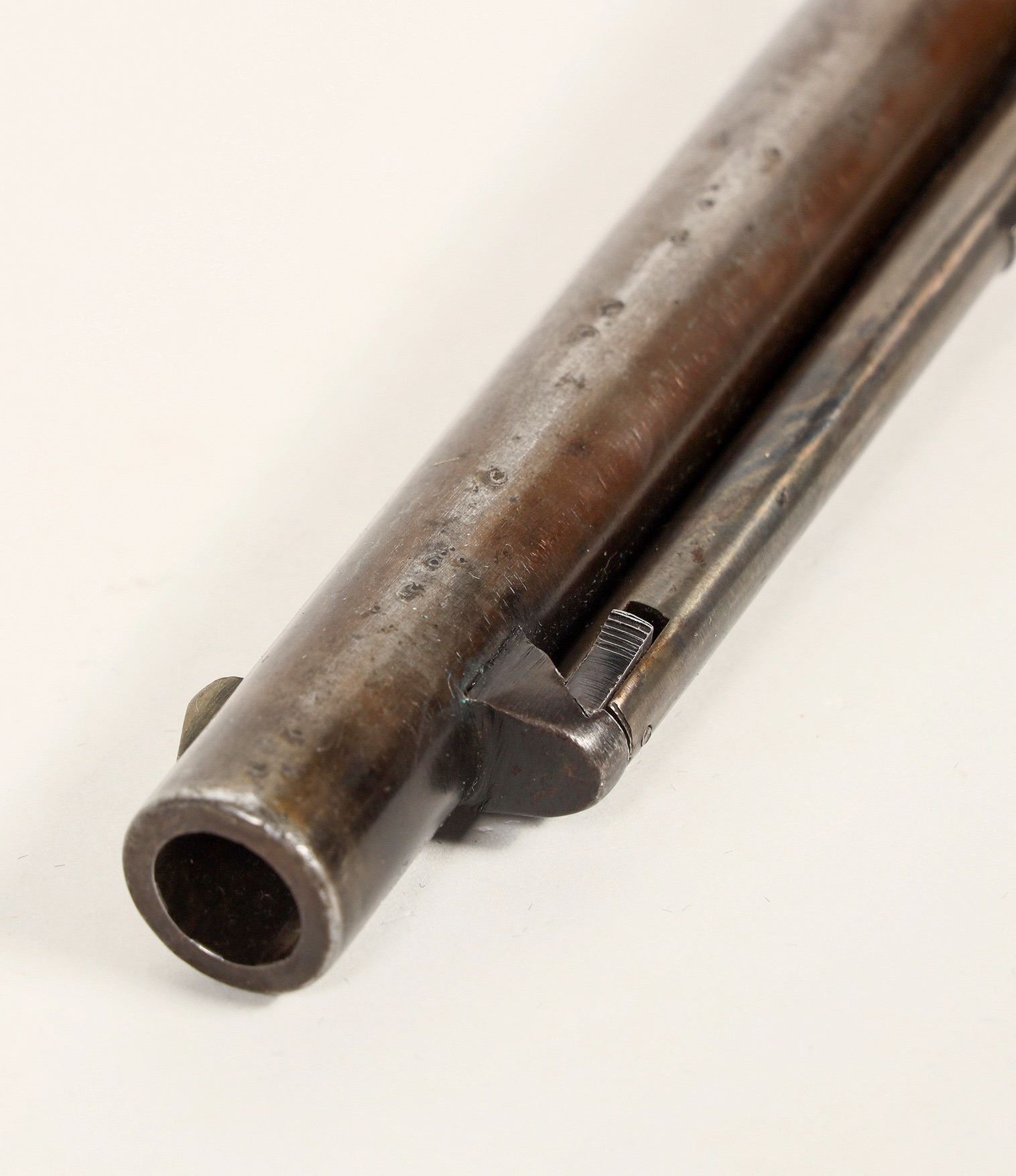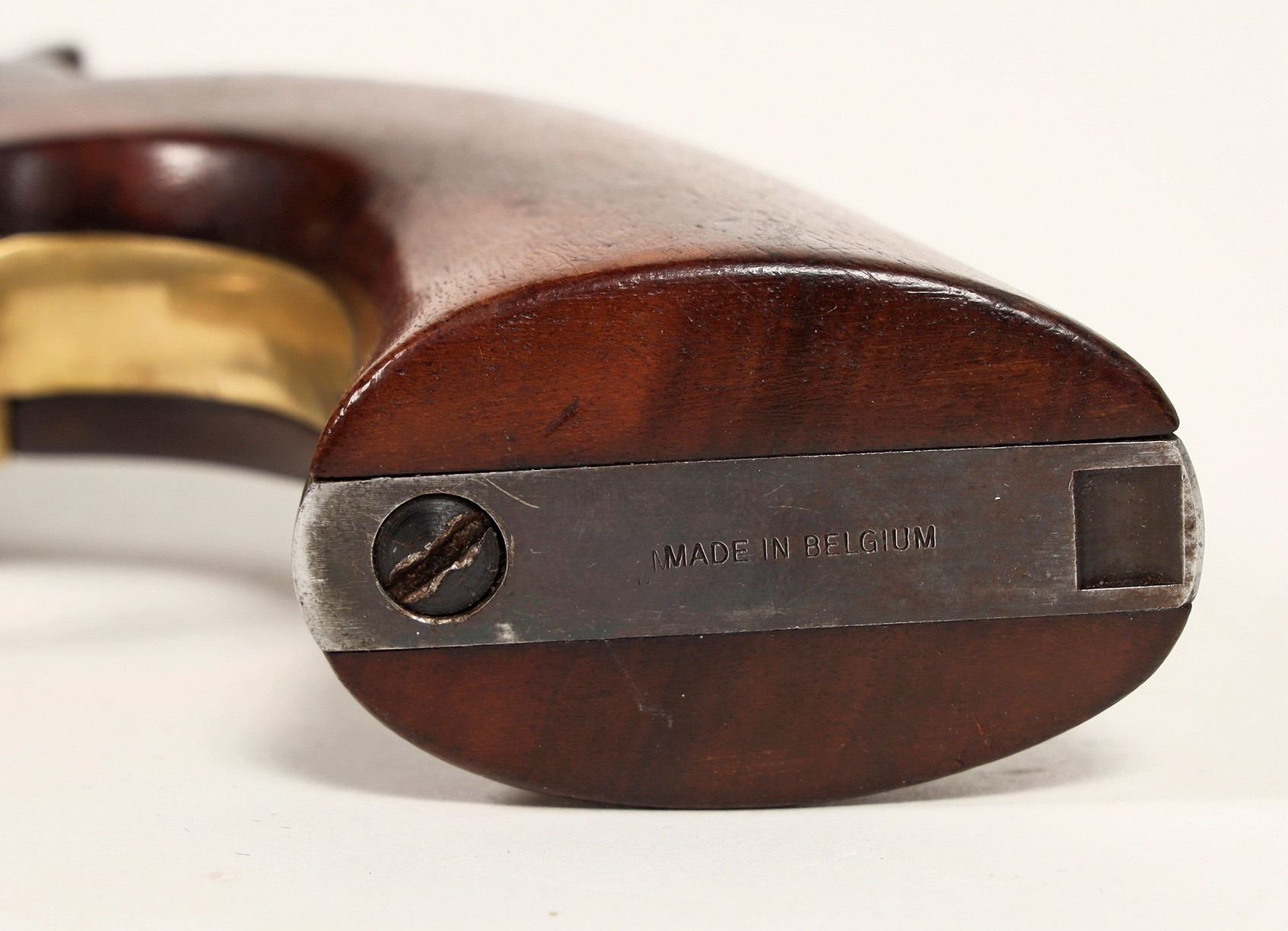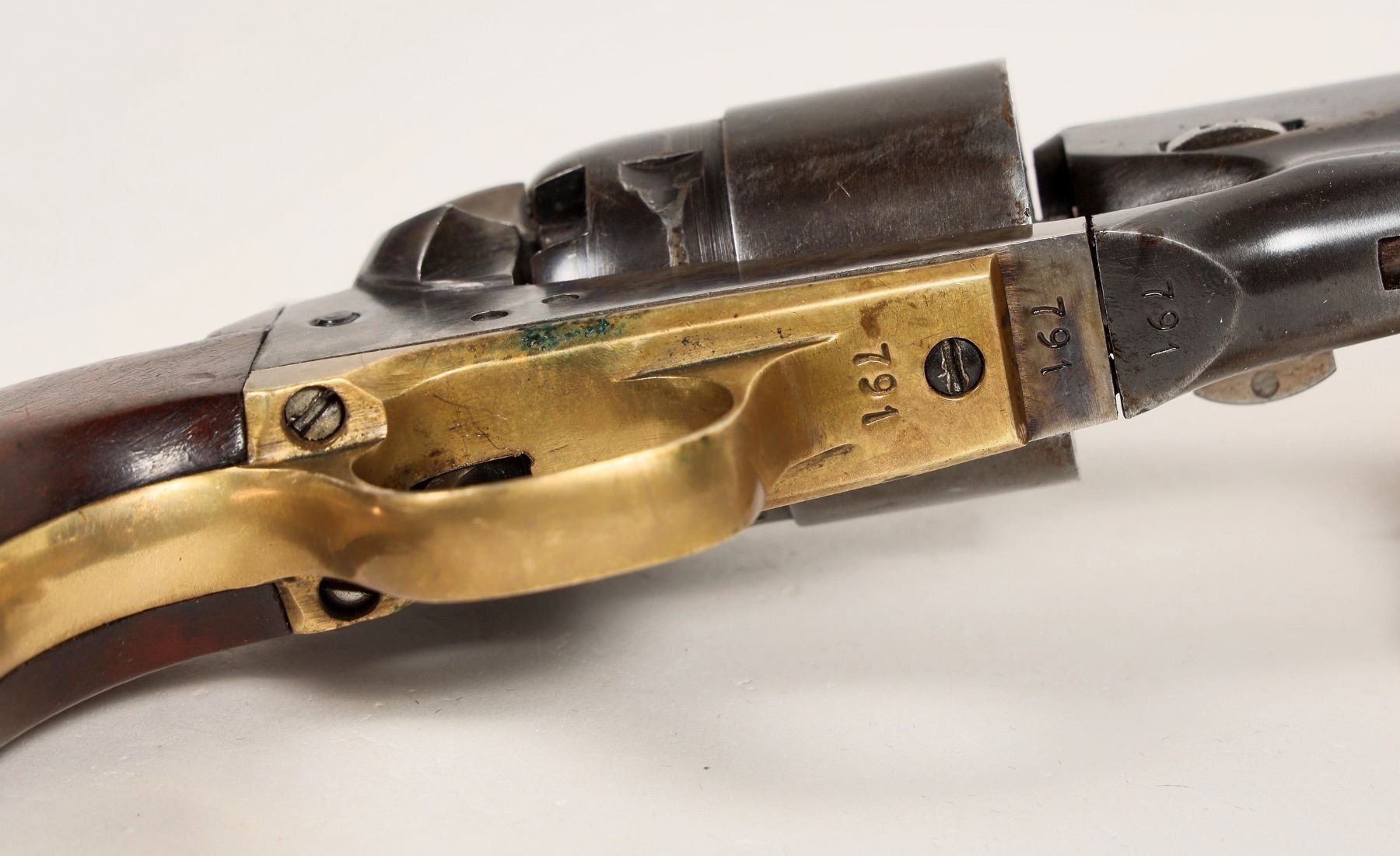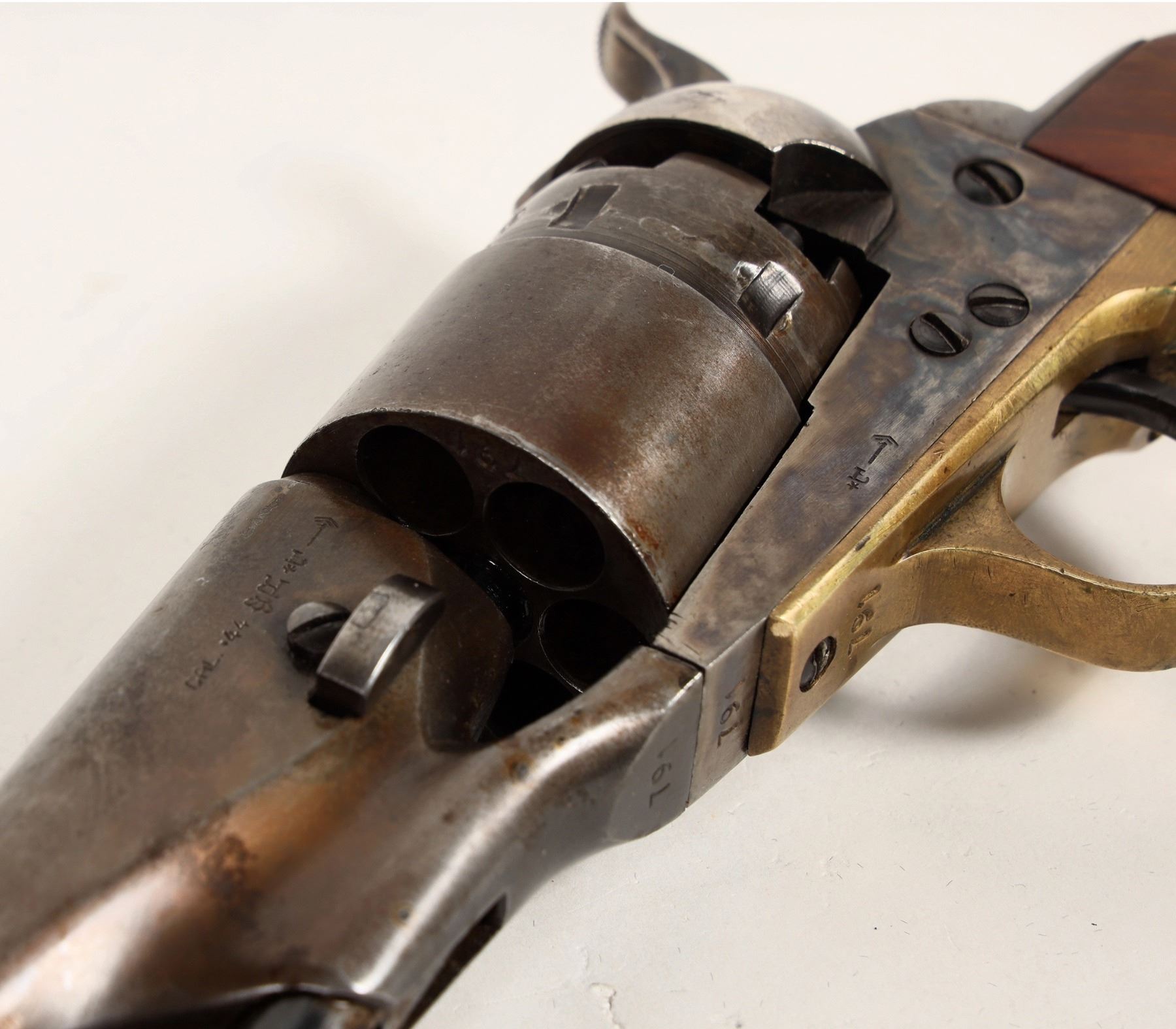 This is a "1860 NEW MODEL ARMY" revolver made in Belgium by Centennial Arms in 1960. It is S/N 791 with all matching numbers on an 8 in. barrel. There is no battle scene engraved on the cylinder which is correct for low serial number guns. It has a three screw frame with a cutaway for stock and "MADE IN BELGIUM" on the bottom of the grip strap. Bluing is complete on one side of the gun. On the left side of the bun bluing is absent and replaced with a patination. The wedge fits poorly. With Belgian proof marks on the barrel, frame, and cylinder. .44 caliber markings. Machined at .442 in. About 40 % bluing left, some external pitting on the barrel, handling marks on the grips. No FFL required. Please see photos for details.