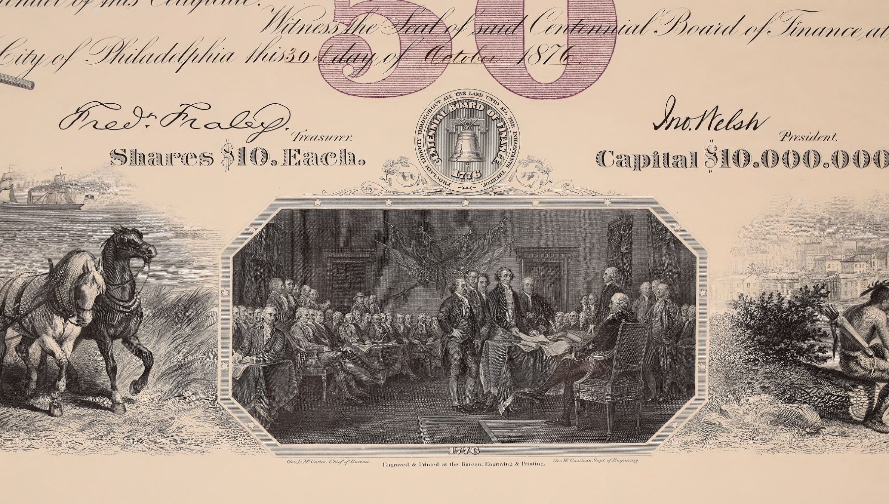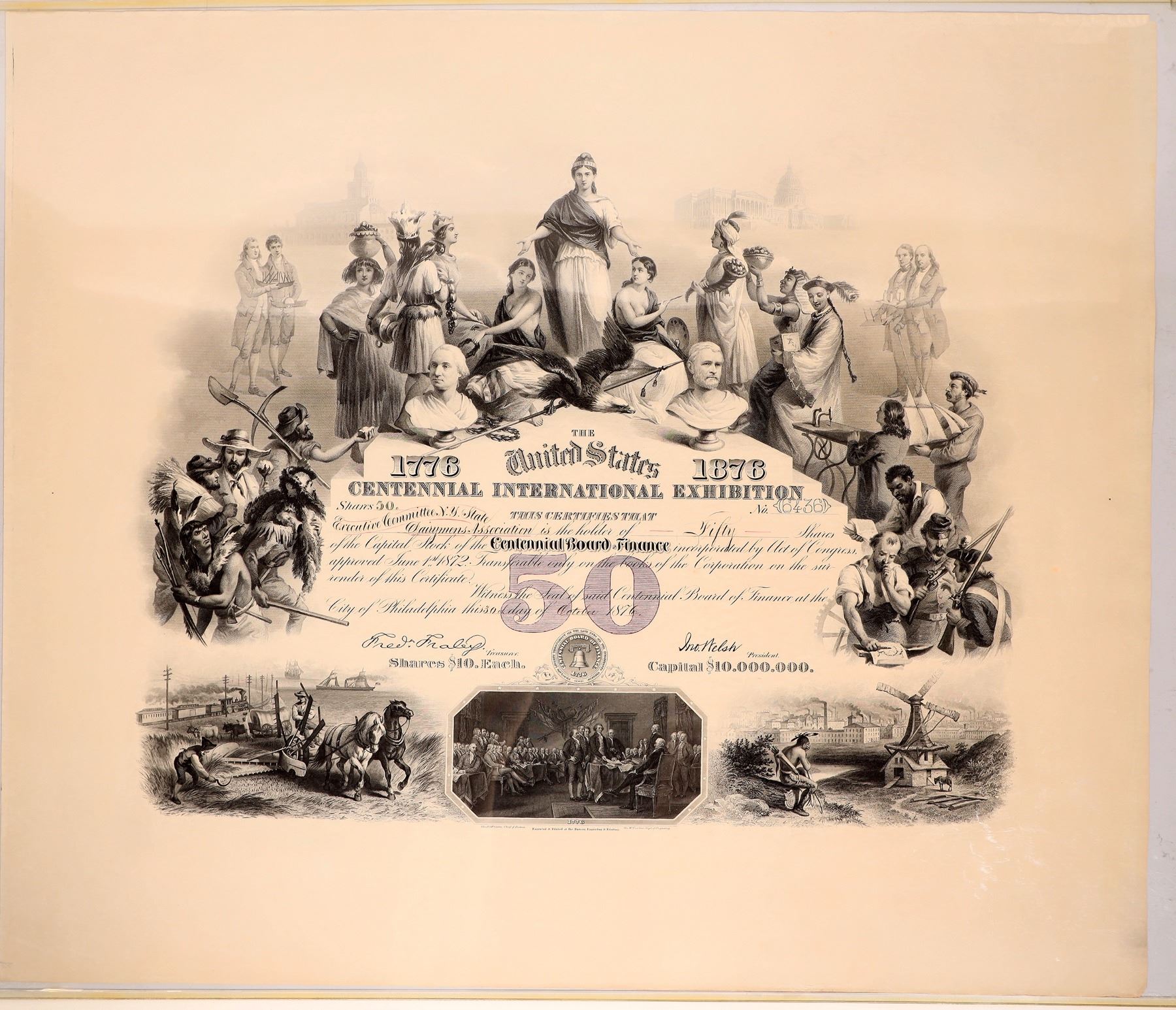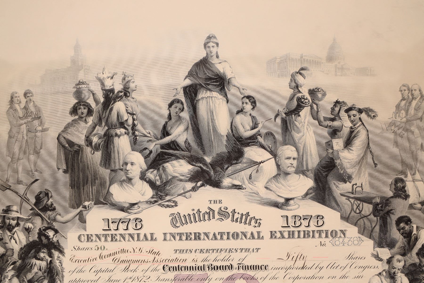 United States Centennial International Exhibition stock certificate, issued to The Dairymen Association for 50 shares at $10 per. It's dated October 30, 1876. It's signed by treasurer Fred Fraley and president, John Welsh. Vignettes include various historic events and people, as well American Indians and an apparent Greek figure overlooking the scene. A very rare piece in very nice condition. Please see photos for more details.