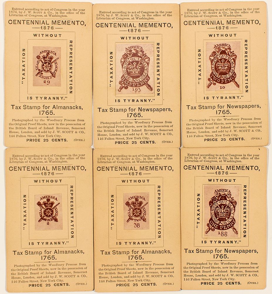 Lot of 6: Centennial Memento Cards, imprinted front and back with the Tax Stamp Act image and history, from 1765. Produced by J.W. Scott & Co of New York. A copy of the actual tax stamp is on each card, surrounded by the original words "Taxation Without Representation is Tyranny." The cards originally sold for 25 cents each. All are in mint condition.