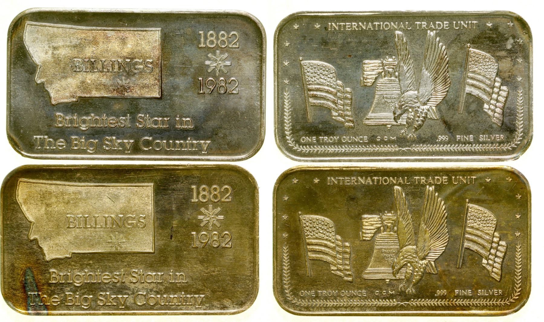 Two one ounce .999 fine silver ingots commemorating Billings 100th anniversary, 1882-1982. "Brightest Star in The Big Sky Country."