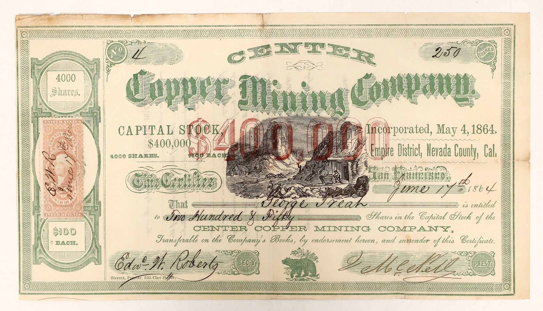 Issued 1864 green Center Copper Mining Co. stock. Located in Empire District, Nevada county. We could not find any detailed info on this mine near Empire Mine. Green print with red underprint. Engraved mine entrance vignette. Small crease tears, tiny center crease hole. Please inspect.