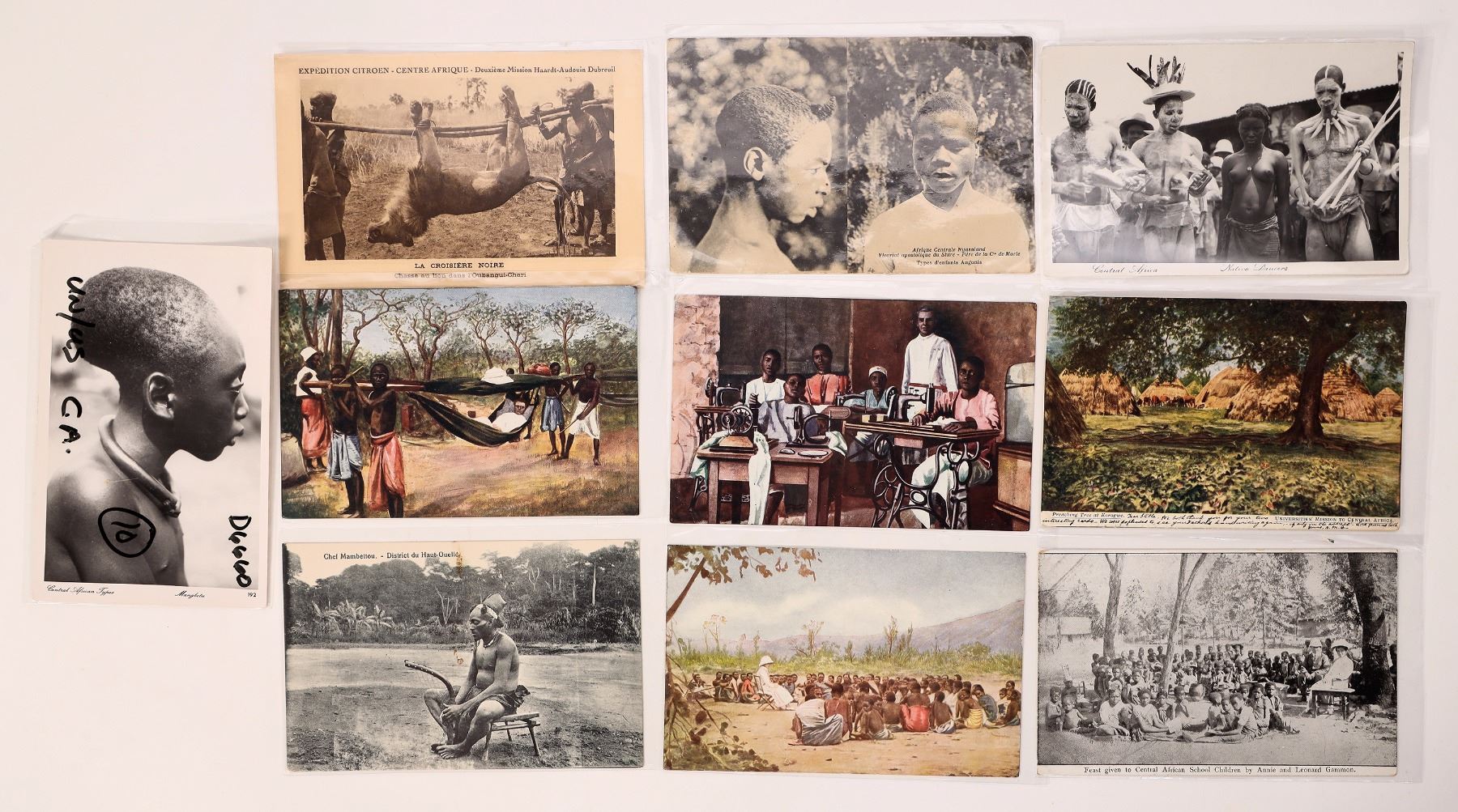 10 Central Africa postcards, 2 RPC's. Natives, Preaching tree, Chef Mambettou, hunted lion being carried etc.[ Africa