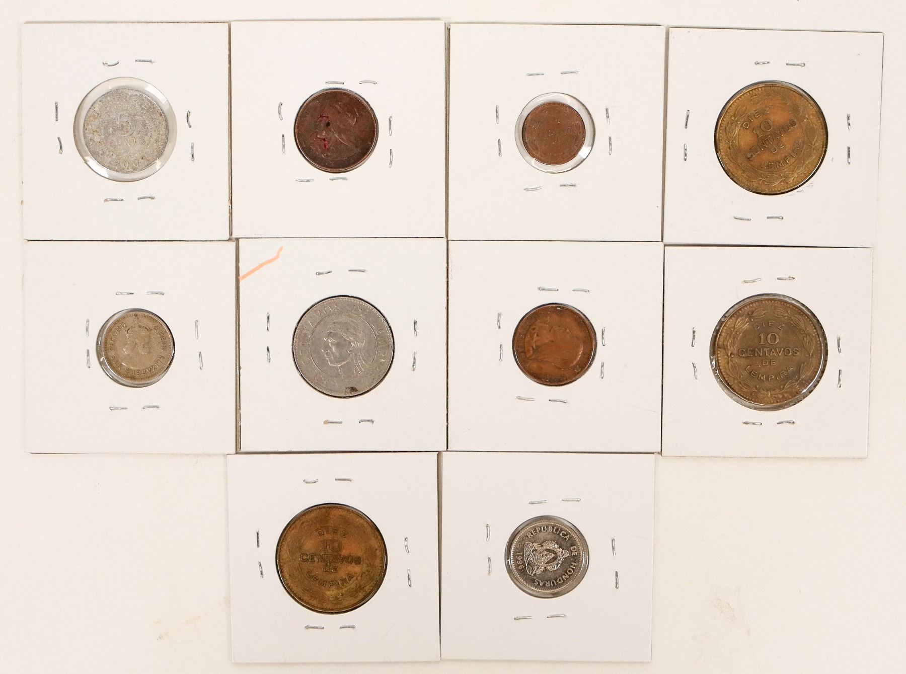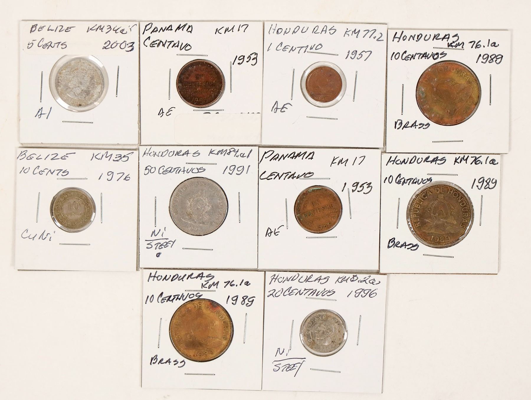 Ten coins of Central America in 2 x 2 cardboard with Krause/Mishler catalog number, date and denomination. Panama (2); Belize (2); Honduras (6). Dates range from 1953-2003.