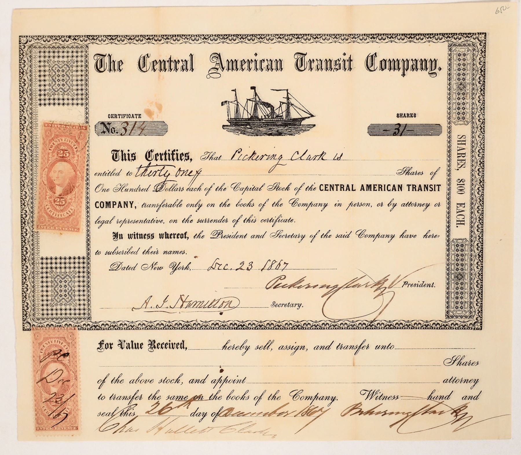 #314, issued for 31 shares in 1867 at New York. Issued to and signed by Pickering Clark as president. Sailing ship with sidewheeler vignette. Two 25 cent revenues. VF. Uncanceled. This company was associated with Cornelius Vanderbilt and his desire to find a way to connect the Atlantic and the Pacific for Gold Rush traffic and commerce. The company ran steamers from the Nicaragua route to California, transporting tens of thousands of passengers from New York to San Francisco in the 1860s. In 1868, it merged with the North American Steamship Company.