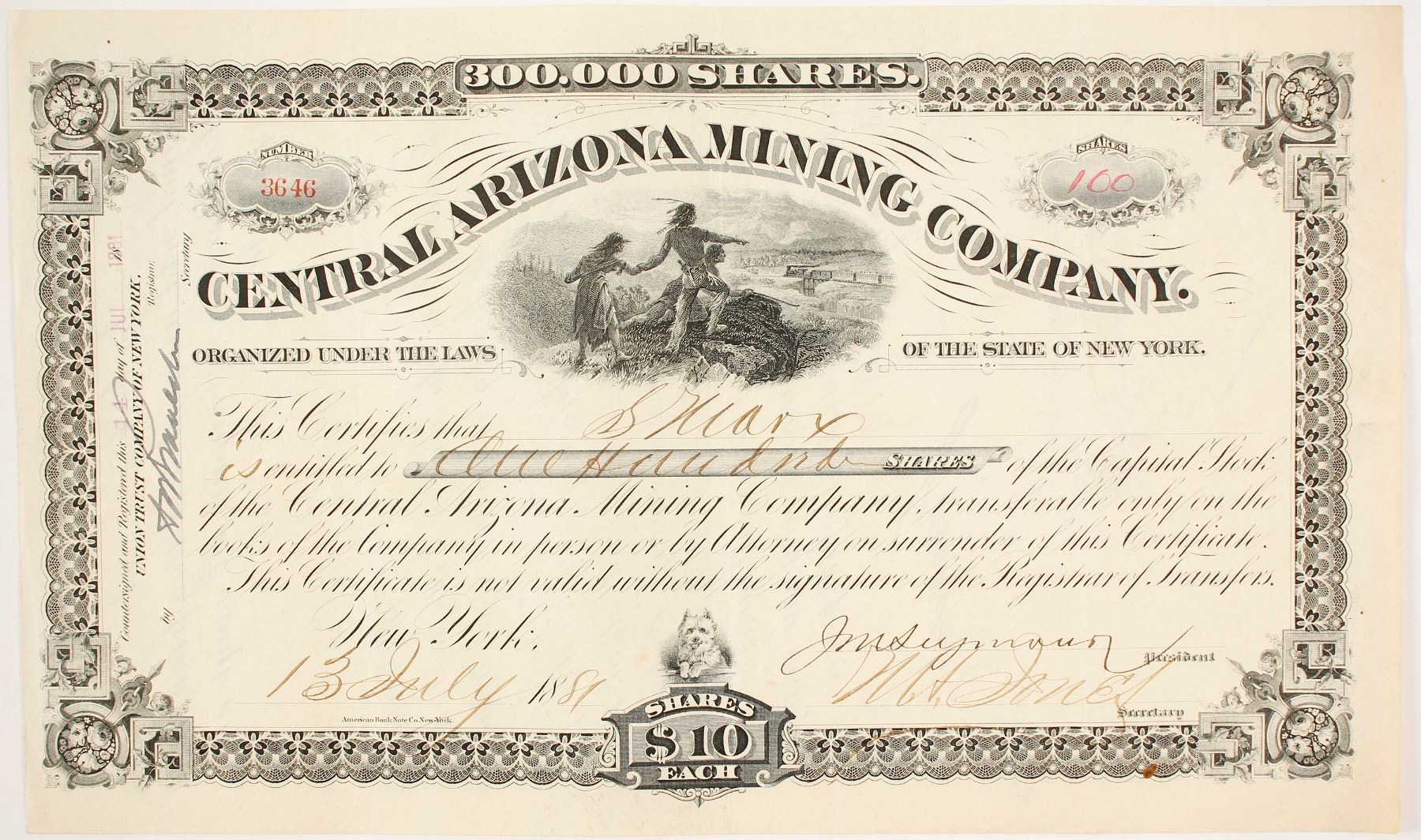 No. 3646. Issued for 100 shares to S. Marx on July 13th, 1881. Signed by the president (James Seymour) and secretary (M.A. Jones). Not cancelled. Ornate border and vignette of Native Americana pointing at a locomotive. Printed by American Bank Note Co. Folds and some toning. 6.5 x 11.25" The company owned the Vulture mine located 14 miles by road from Wickenburg at the southern margin of the Vulture Mountains, and about 9 miles west of the Hassayampa River. The Vulture mine was discovered in 1863 when a German named Henry Wickenburg and several companions discovered a butte of quartz with traces of gold. Mr. Wickenburg processed rich portions of the outcrop in an arrastra at the Hassayampa River. The Apache Indians made mining difficult and dangerous. In 1866, the Vulture MC acquired the property and built a 40-stamp amalgamation and concentration mill near the site of the present town of Wickenburg. All of the machinery for the mill was shipped from San Francisco by water to Fort Mohave, a landing on the Colorado River, and hauled overland via Prescott. In 1873, P. Smith and P.W. Taylor located a claim on the western extension of the Vulture lode and built a 5-stamp mill at the Hassayampa River. They operated for about six years and produced about $150,000 worth of gold bullion. In 1879, the Central Arizona MC was formed by James M. Seymour of New York to work the Vulture and Taylor-Smith mines. An 80-stamp mill was built at the mine. The company treated a large amount of low-grade gold ore. It is estimated the company produced about $2,000,000 worth of gold bullion during its operation. The company lost the ore body at the 300' level and the mine closed again in 1888. The Vulture mine had been the most productive of Arizona's gold mines. The town of Seymour was named after James M. Seymour, signer of this certificate. (Ref: Browne, 1868, p477; Burchard, 1882, p302; Wilson, 1967, p137, 157; Dunning, pp62-3, 120-1; Barnes, p196; Sherman, p136-7, 164-5; Spude et al, p5-6.) City: Vulture State: Arizona Date: 1881