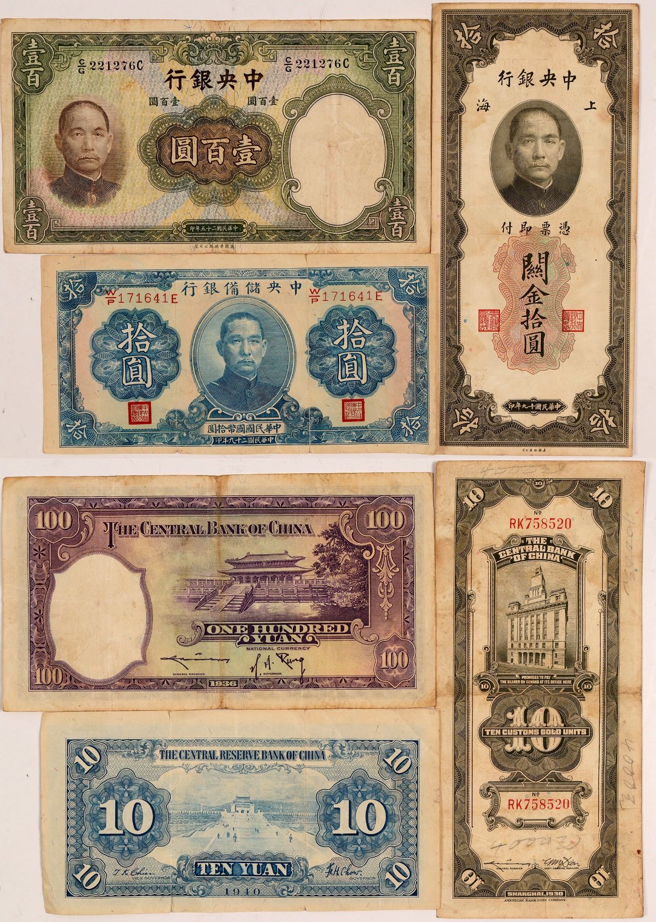 Lot of three: 1) 100 Yuan, 1936; 2) 10 Yuan, 1940; 3) 10 Customs Gold Units, Shanghai, 1930. All fine to extra fine. China