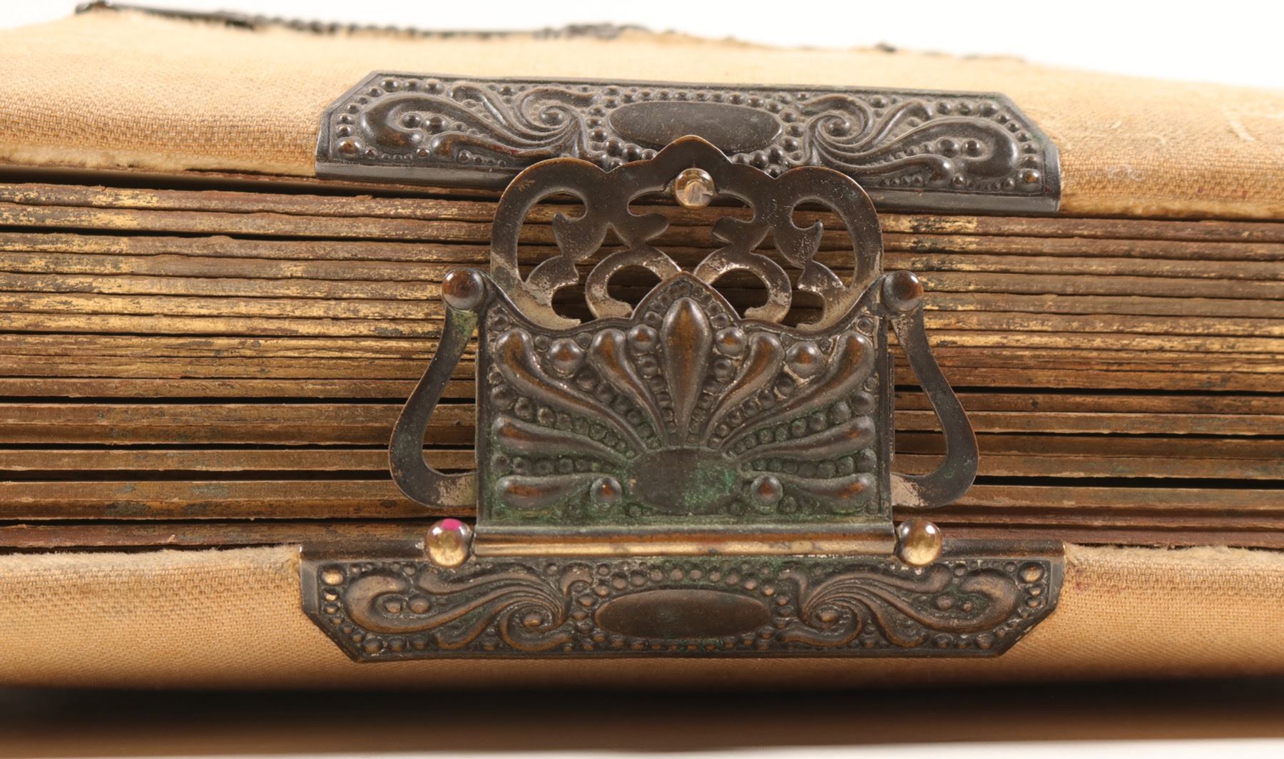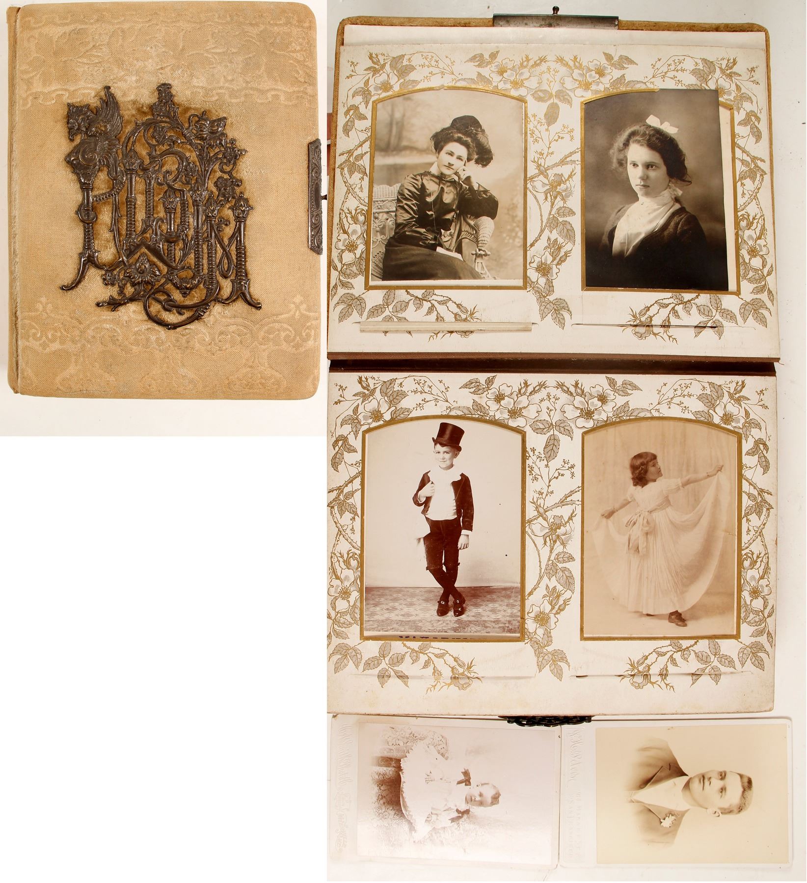 Vintage album with fancy brass "Album" on cover. Mostly cabinet card portraits approx 59. Hollister, San Jose, Fresno etc.