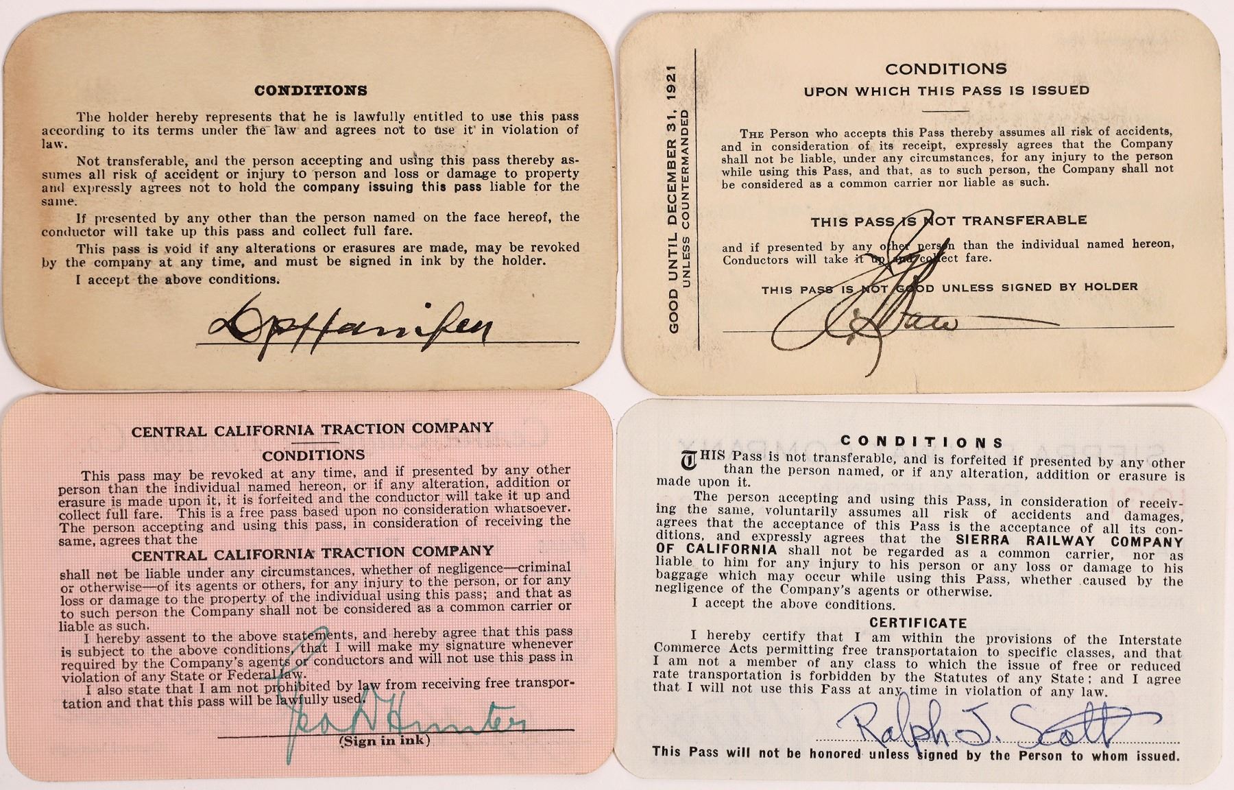 Lot of four railroad passes from Central California: 1) 1920 Inland Empire Railroad Company No. 284, issued to Mr. D. P. Hanifen; 2) 1921 San Joaquin and Eastern R. R. Co., No. 225 issued to J. T. Bate; 3) 1930 Central California Traction Co., No. 204, Geo. D. Hunter; 4) 1931 Sierra Railway Company of California No. 260 issued to Ralph J. Scott. State:California City: Date: Provenance: