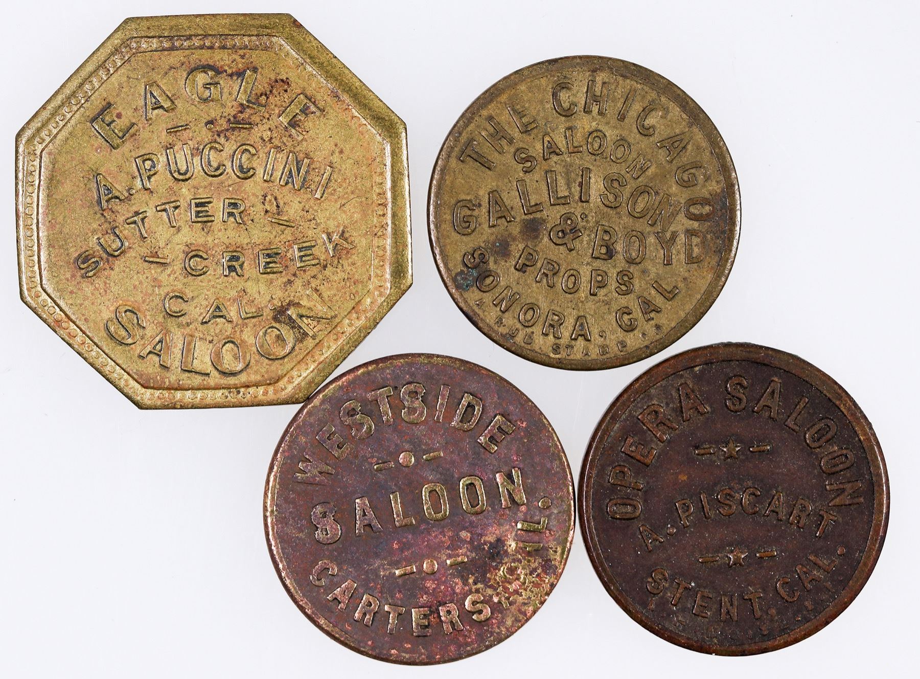 Lot of four saloon tokens: 1) Carters: Westside Saloon; 2) Sutter Creek: Eagle Saloon; 3) Sonora: The Chicago Saloon; 4) Stent: Opera Saloon.