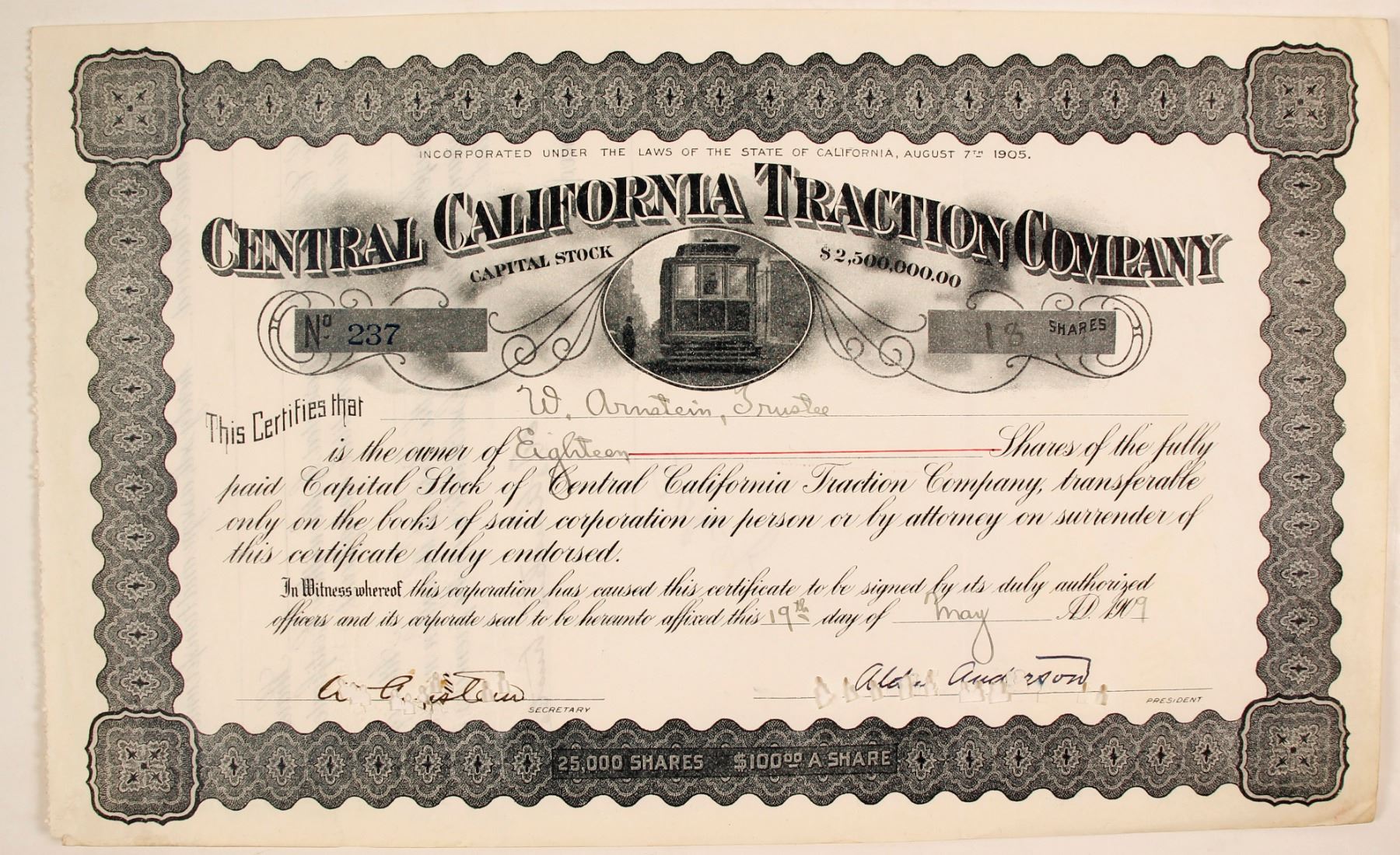 The Central California Traction Company was founded on August 7, 1905, as an alternative city streetcar line to the Stockton Electric Railroad. The company soon had greater ambitions and became a 1,200-volt DC electric interurban railway,[1] opening a line from Stockton to Lodi in 1907, and reaching Sacramento by 1910.