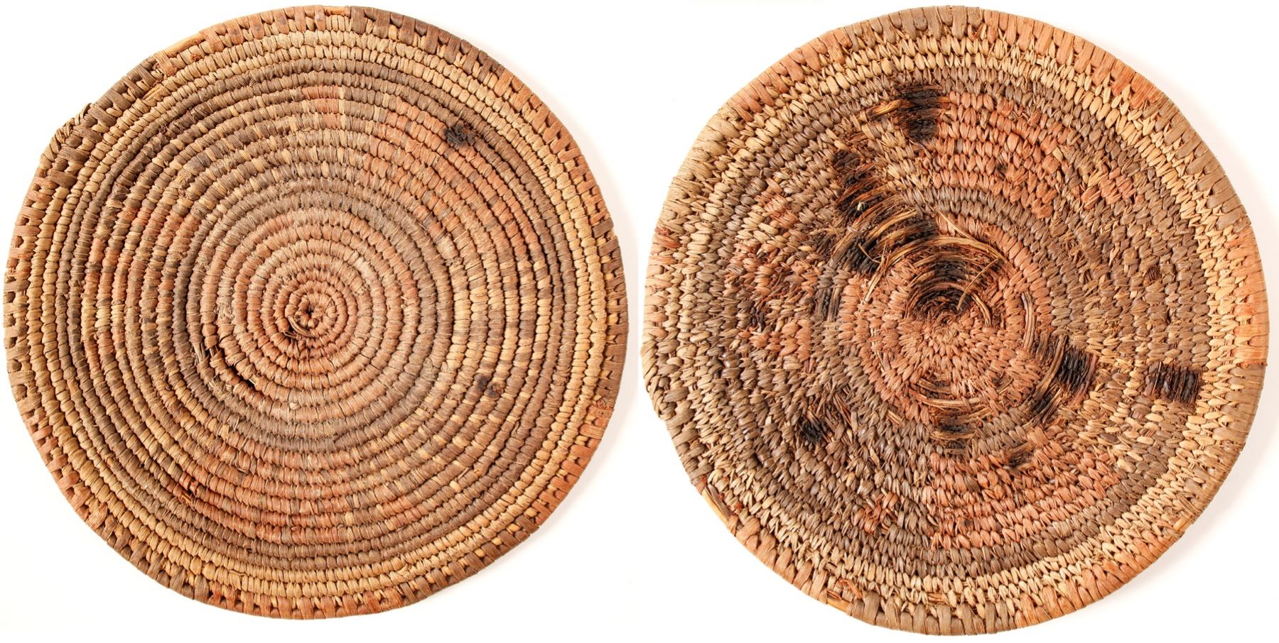 Six inch diameter, polychrome flat "tray" with patterns typical of Yokut influence. Heavily damaged on one side, the other good for display. Intricate color patters difficult to make out. Pollock CollectionGeff Pollock Collection