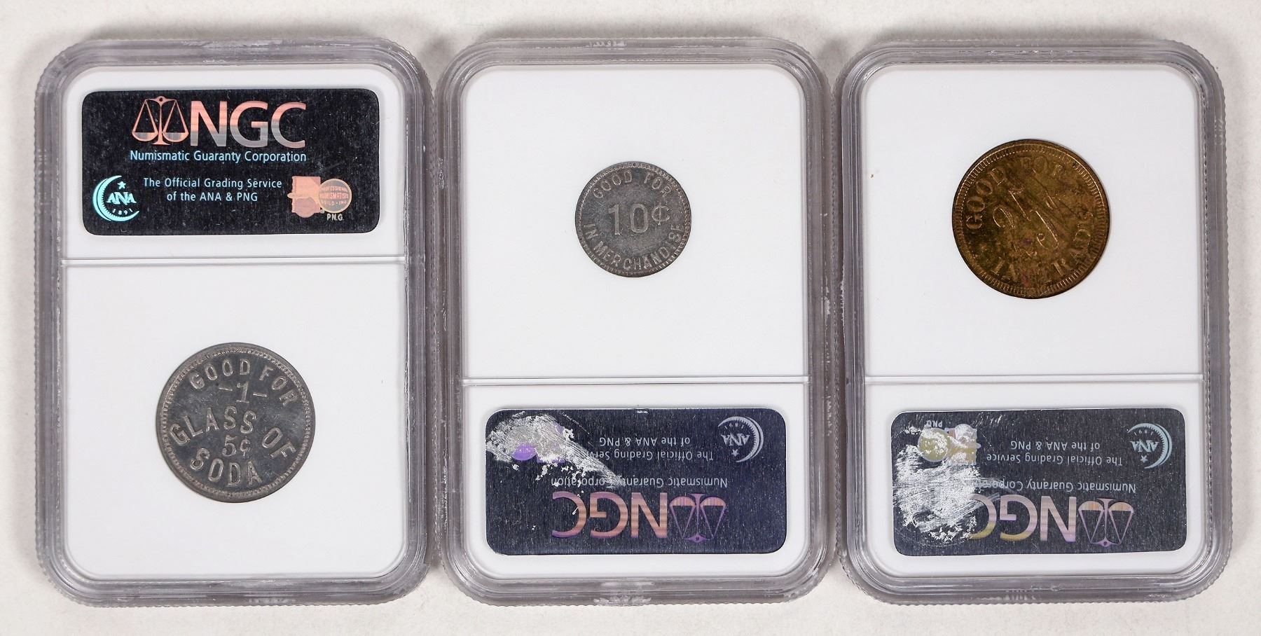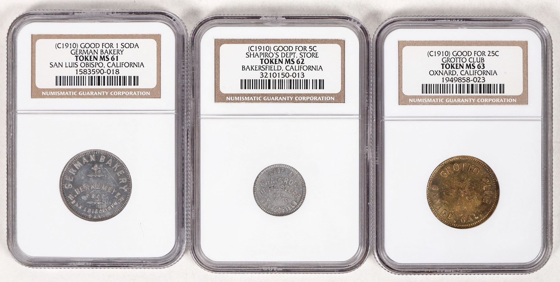 Three NGC uncirculated graded tokens: 1) NGC MS 62: TRADE AT / SHAPIRO'S / DEPT. STORE / 19TH & K STS. / BAKERSFIELD / L.A. RUB. STP. CO. // GOOD FOR / 5¢ / IN MERCHANDISE; Al., rd., 21 mm. 2) NGC MS 63: GROTTO CLUB / OXNARD, CAL. // GOOD FOR / 25¢ / IN TRADE; Br., rd., 24 mm. 3) NGC MS 61: GERMAN BAKERY / H. BERKEMEYER / PROP. / SAN LUIS OBISPO, / CAL. // GOOD FOR / 1 / GLASS OF / 5¢ / SODA: Al., rd., 25 mm.