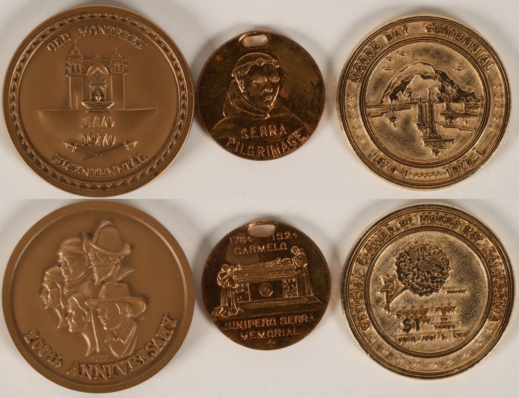 Lot of three: 1) 1970 Morro Bay Centennial, 35 mm; 2) Junipero Serra memorial, Carmel, 26 mm; 3) 1970 Old Monterey Bicentennial, bronze, 38 mm.