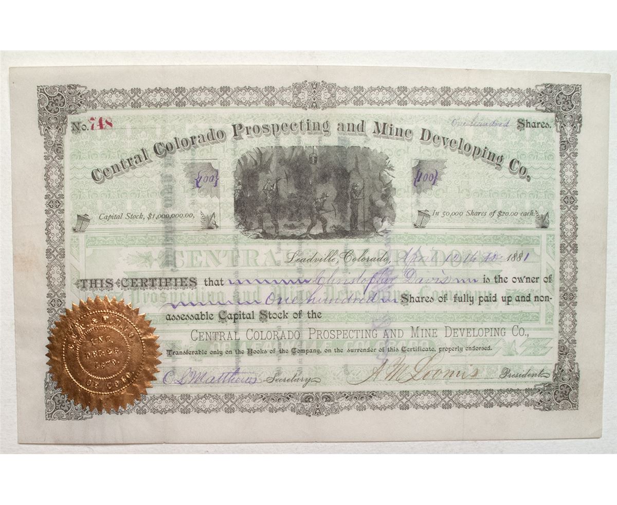 Incorporated in Colorado in 1879. Cert. #748, issued to Christopher Davis for 100 shares. Signed by A.M. Loomis, president, and O.S. Matthews, secretary. Central mining vignette, black border on green safety printed paper, gilt seal. U/C. Printer not noted. Endorsed by Christopher Davis on reverse. Datelined Leadville, Colorado. No creases. VF.