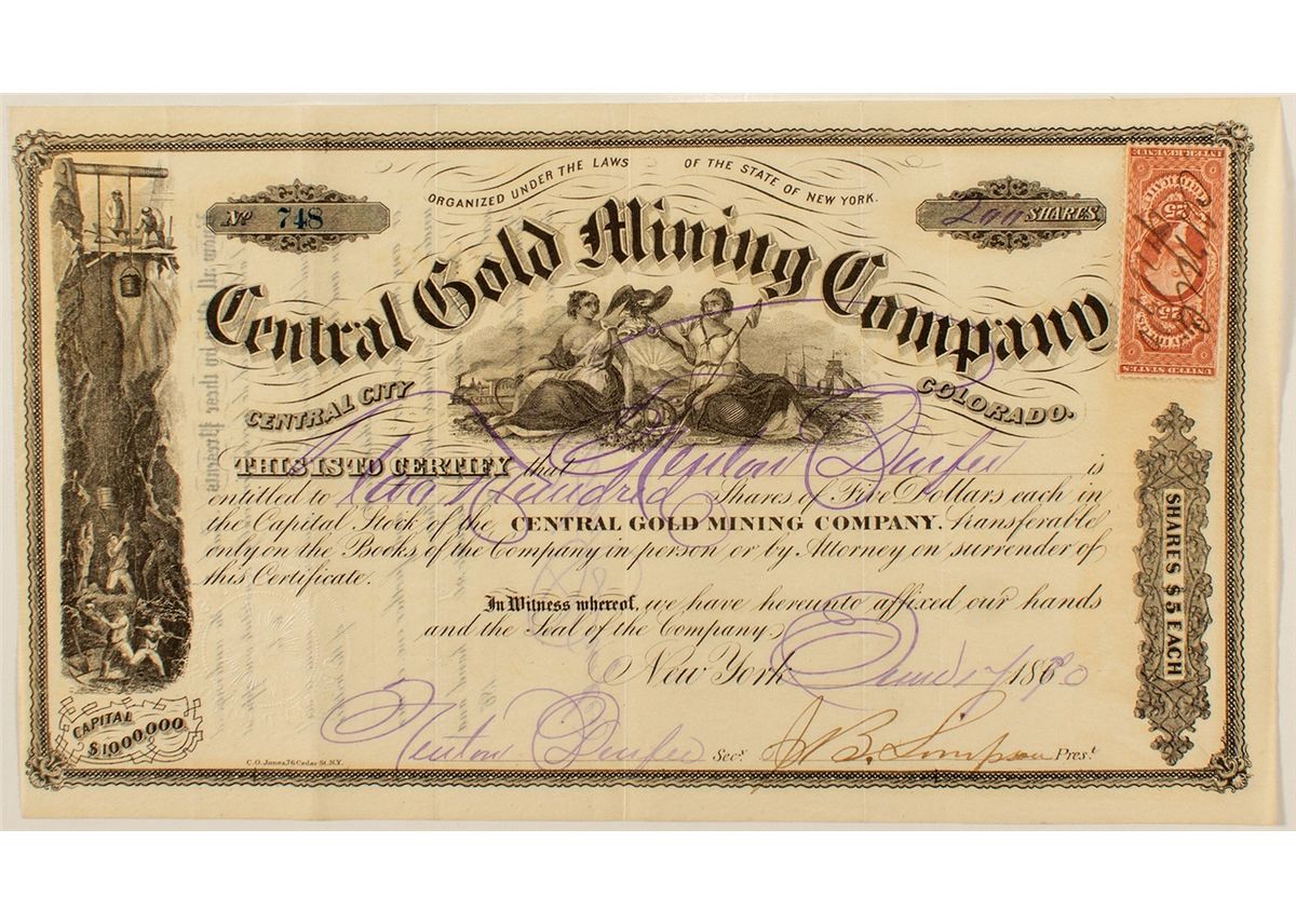Inc. in New York. No. 748. Uncancelled. Issued for 200 shares to Newton Durfee (?) on June 1, 1870. Signed by the president and secretary (also Durfee). Reverse signed by Durfee. Printer: C.O. Jones, N.Y. Twenty-five cent revenue stamp upper right corner. Two vignettes: miners and hoisting bucket (left) and two women with an eagle, ship and train surrounding (center). The mine operated in Central City. Condition: folds.City: Central CityCounty: GilpinState: CODate: 1870