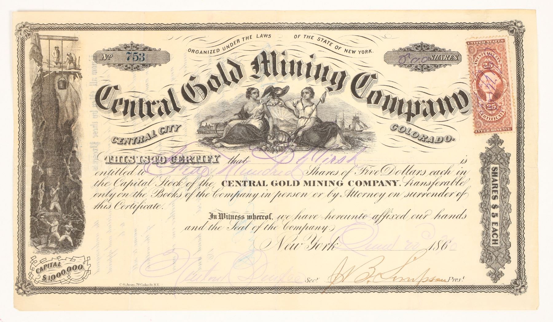 Central Gold Mining Company Stock Certificate, Central City, Colorado, 1870 [204912]