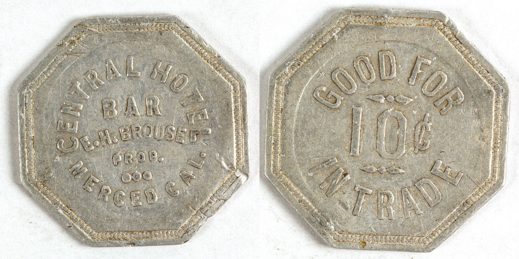 Obv.: Central Hotel / Bar / E. H. Brouse / Prop. / Merced, Cal.; Rev.: Good For / 10c / In Trade. Al., octagonal, 29 mm. Daniel Manasselian Collection. State: California City: Merced Date: ID# 78245