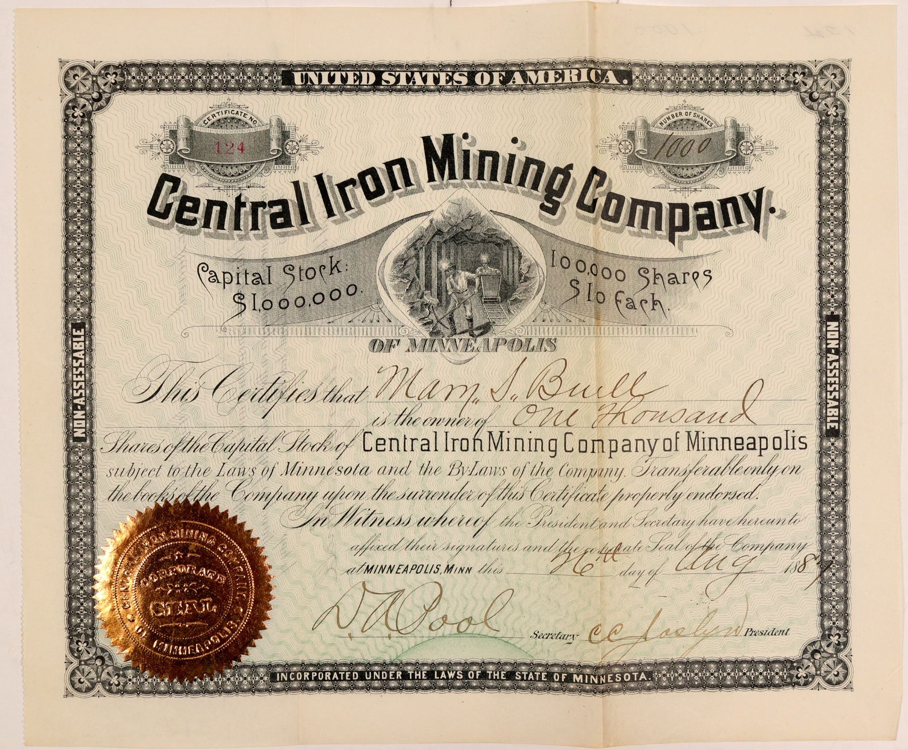 I/U #124 Mary Buell 1000 shares 1887. Signed by president CC Joslyn. Minnesota iron deposits