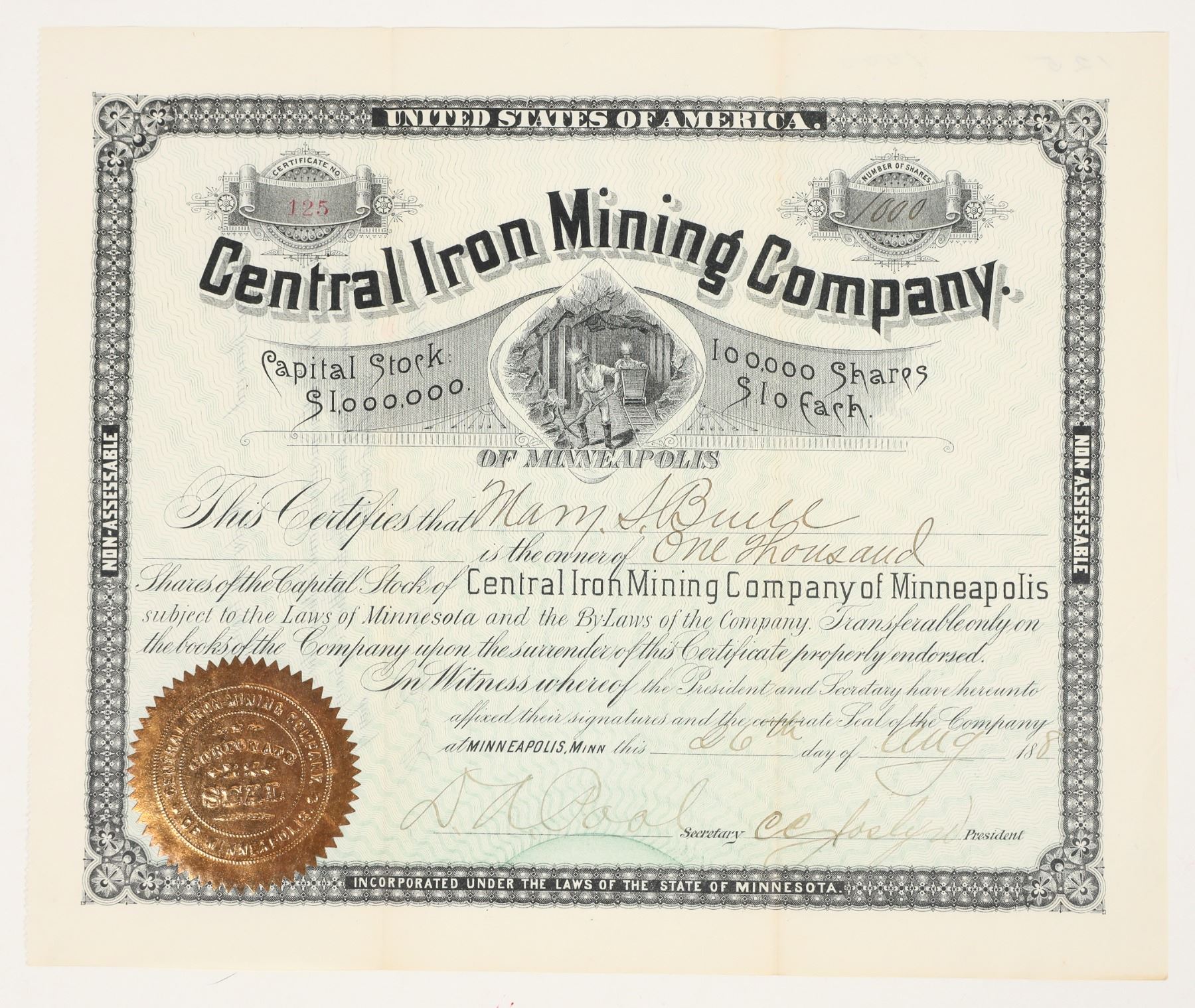 Inc. in Minnesota. No. A25, issued for 1000 shares to Mary A. Buell in 1887 in Minneapolis. Signed by president CC Joslyn and secretary DA Pool. Not cancelled. Black border and print, gold seal, and mining vignette. Deep folds. According to the Star Tribune (June 3rd, 1887), Pool was reporting they had 1,000,000 tons of ore on their property on the St. Croix Range at Knapp, Wisconsin. A May 24, 1887 article mentions they have property in Ashland County in the Penokee Range (Lake Superior).