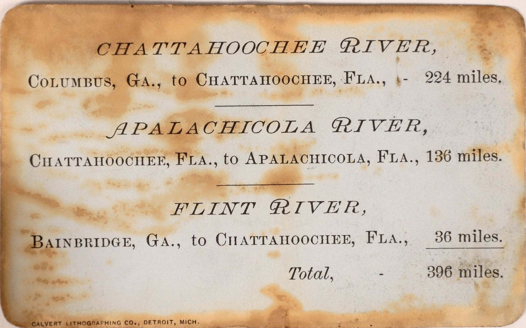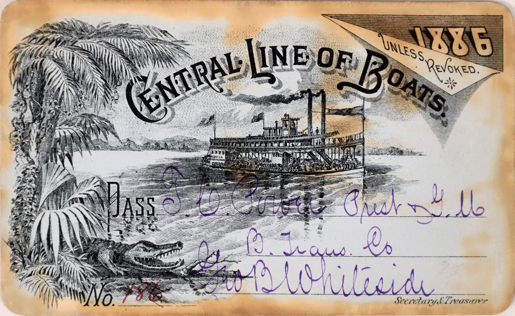 Reverse lists the three routes: Chattahoochee River, Columbus, GA to Chattahoochee, FL, 224 miles; Apalachicola River, Chattahoochee, FL to Apalachicola, FL, 136 miles; and Flint River, Bainbridge, GA to Chattahoochee, FL, 36 miles. Pass no.186 issued to the year 1886 to TC Power, president of the Benton Transportation Co. (and Indian Trader and Montana senator). Not endorsed by Power. Signed by secretary/treasurer Geo. B. Whiteside. Great design on light blue cardstock with vignette of alligator on the river shore as a steamer passes by. Heavy discoloration around borders. Printed by Calvert Litho., Detroit.
