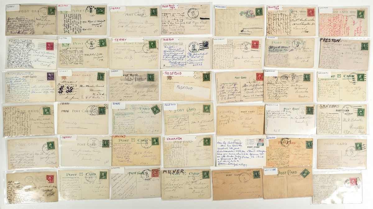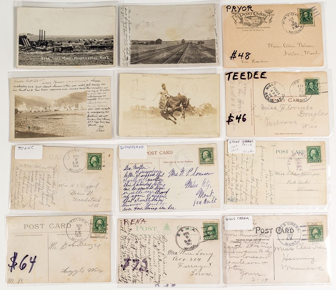 56 total. 14 RPC's. Counties include Treasure, Fallon, Prairie, Powder River, Carter, Custer, Big Horn, Musselshell, and Rosebud. Scenes include RPC Star Coal Mine, RPC bird's eye of Roundup, RPC Sanders railroad with a tongue-in-cheek "Busy Day", RPC of Baker, RPC of Indian Teepees "on the hunt", RPC of Lee Caldwell on Flying Devil at Rodeo, etc. Post marks include 1917 Rema (1915-1920), 1912 Wills Creek (1910-1917), 1915 Toluca (1914-c1926), 1916 Stone Shack, 1911 Sutherland (1909-1936), Sanders, Preston, Moorhead, Powderville, Wyola, Waldheim, Terry, Roundup, Westmore, magenta Musselshell, Milner, Vananda, Rosebud, Sumatra, Tee Dee, Morland, Sykes, Sabra, Mizpah, Pryor, and Stacey. City: State: Montana Date: Inventory# 40035