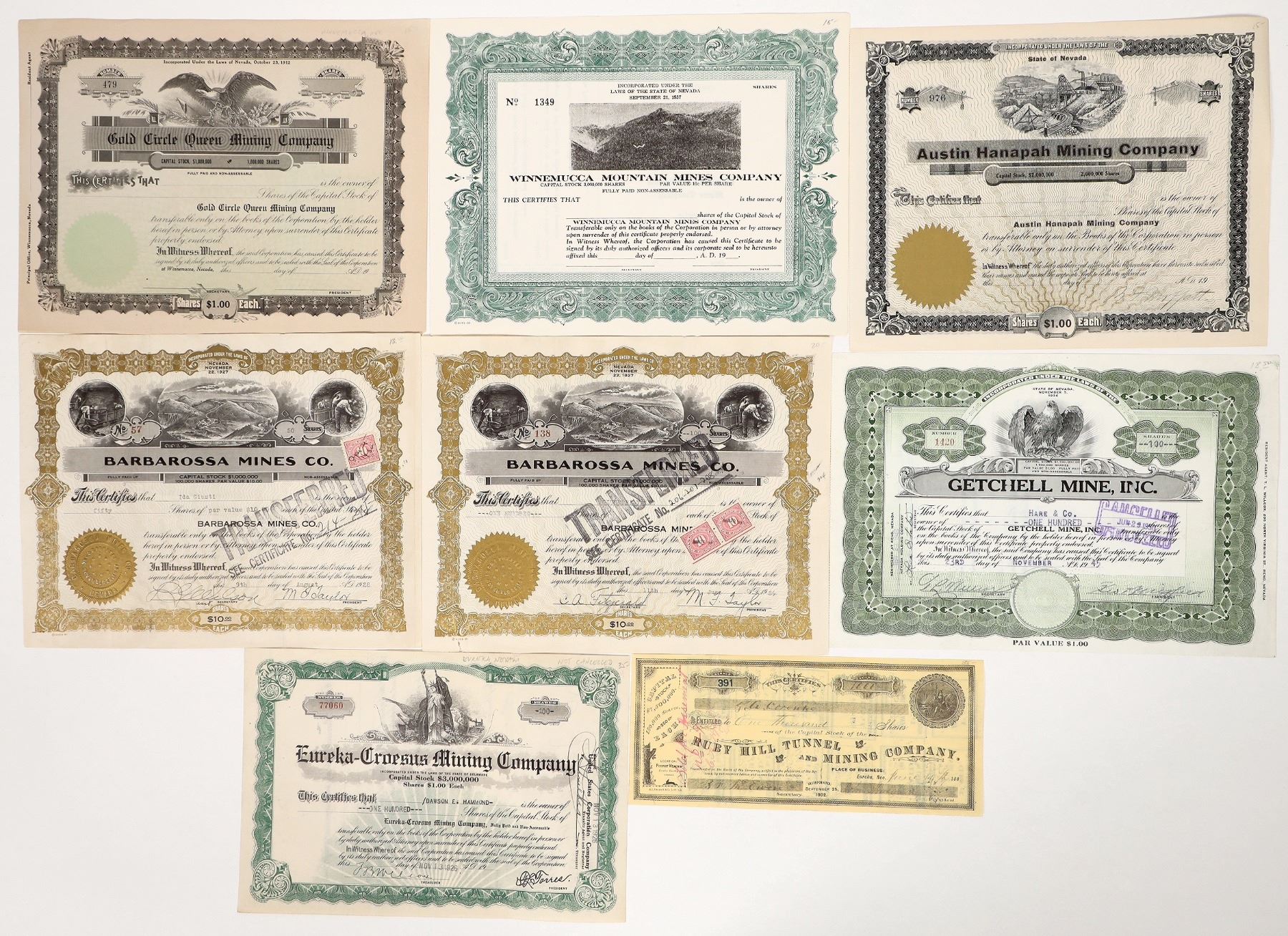 Gold Circle Queen-corner chip, Winnemucca Mountain Mines, Austin Hanapah, Ruby Hill Tunnel, Barbarossa Mines x2, Eureka-Croesus, Getchell.