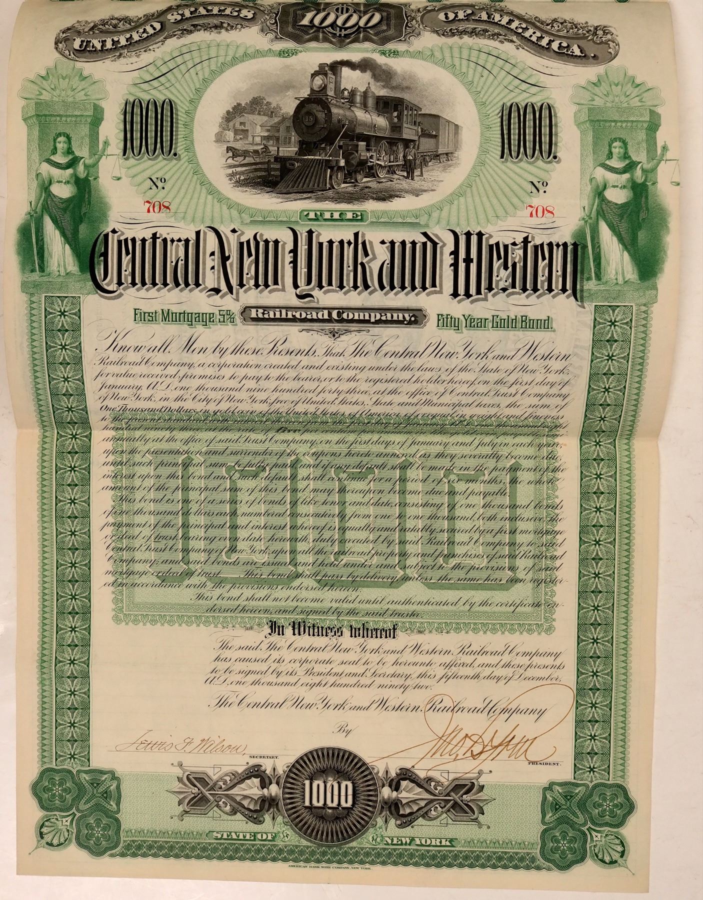 Cert. #708, issued in 1892. $1,000, 1st Mtg. 5%, 50 year gold bond due 1943. Vignette of a man beside a train and justice at both sides. A page and a half of coupons attached at the front. Uncancelled. ABN, New York.