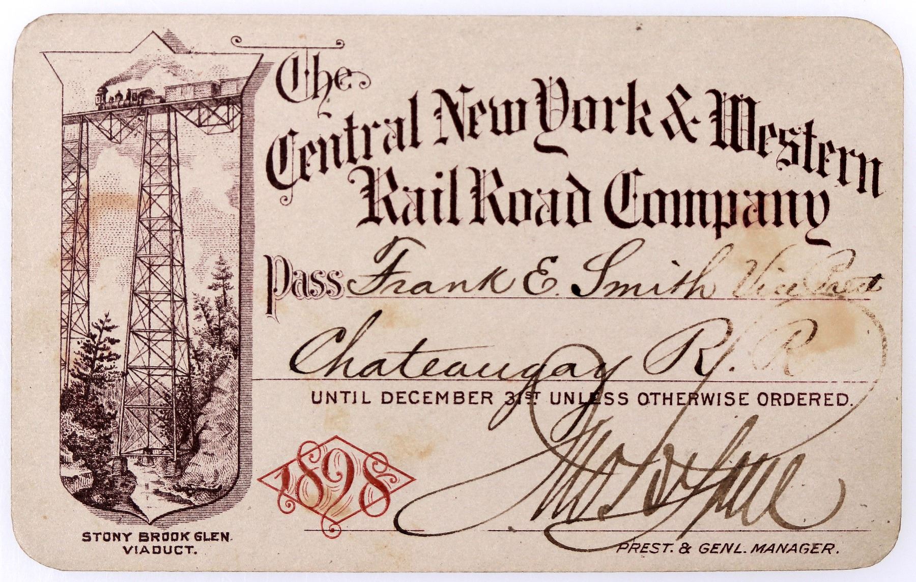 Pass no. 952 issued for 1898 to Frank E. Smith, vice president of Chateaugay Railroad. Signed by president and general manager John Byrne. Purple and red print on cardstock with dramatic vignette of train crossing Stony Brook Glen Viaduct. Some staining. Organized in 1892. In 1899, the railroad merged with Pittsburgh, Shawmut & Northern Railroad.