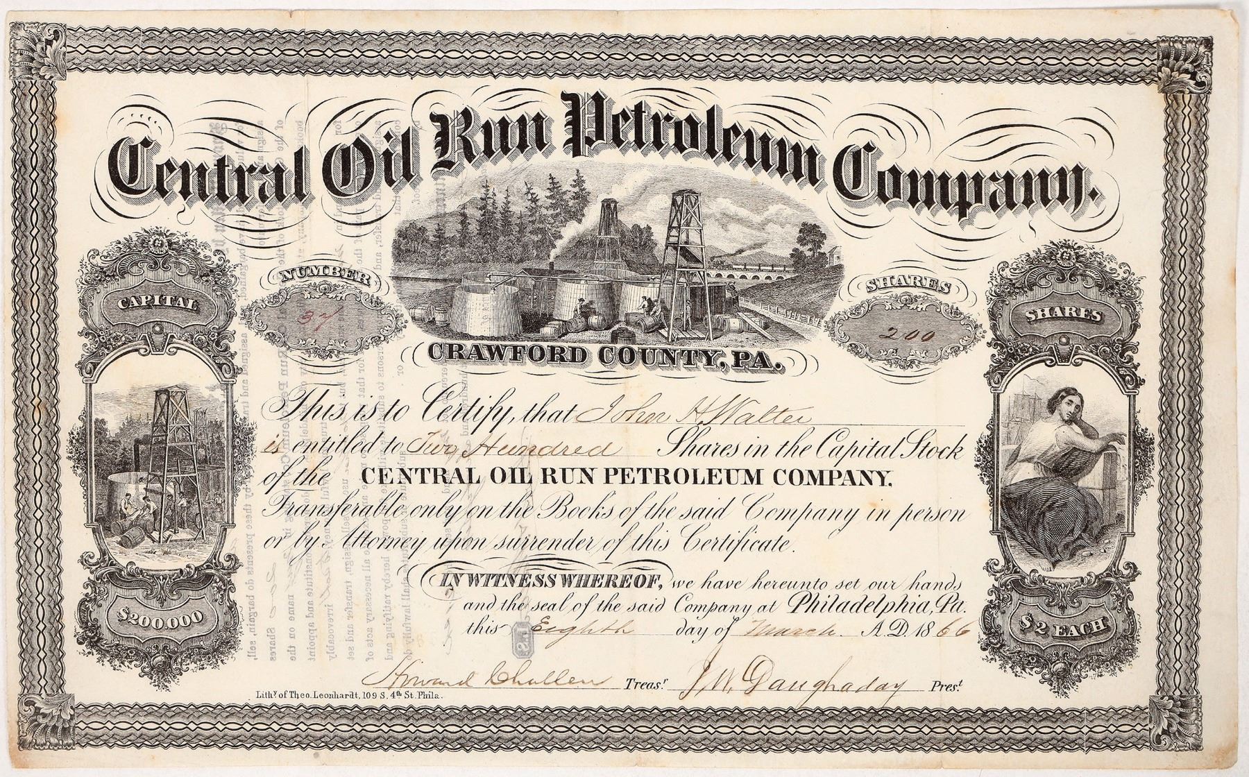 Central Oil Run Petroleum Company, issued at Philadelphia in 1866. Cert. #37. Three nice vignettes. Oil was discovered at Titusville in Pennsylvania in 1859.