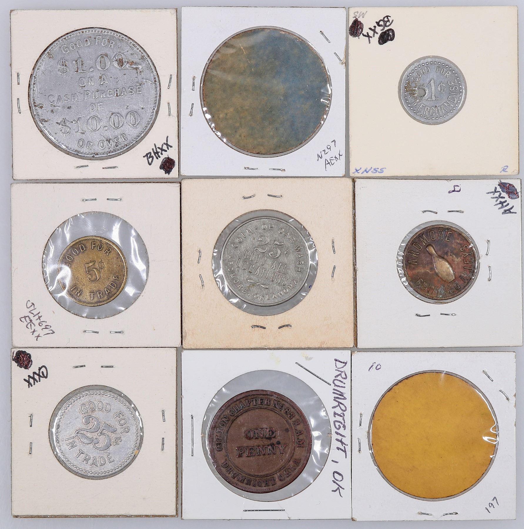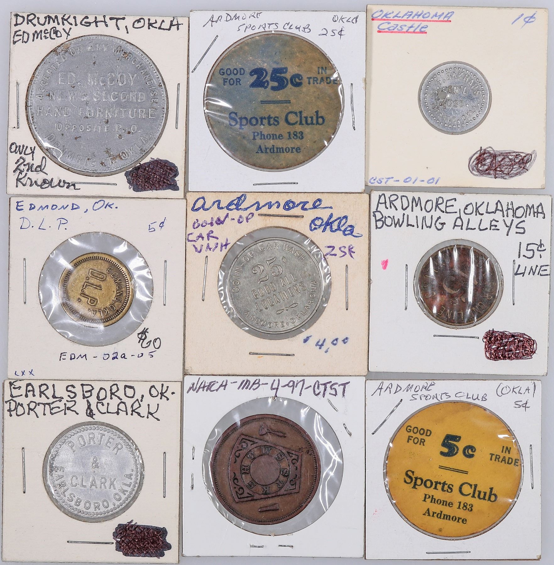 Lot of nine tokens from Oklahoma: Ardmore (4): Ardmore Bowling Alleys, Sports Club (2), Coin-Op car wash; Castle: O. F. Bakhaus GF 1c, holed; Drumright (2) Ed McCoy, R.A.M. penny; Earlsboro: Porter & Clark; Edmund: D. L. P.