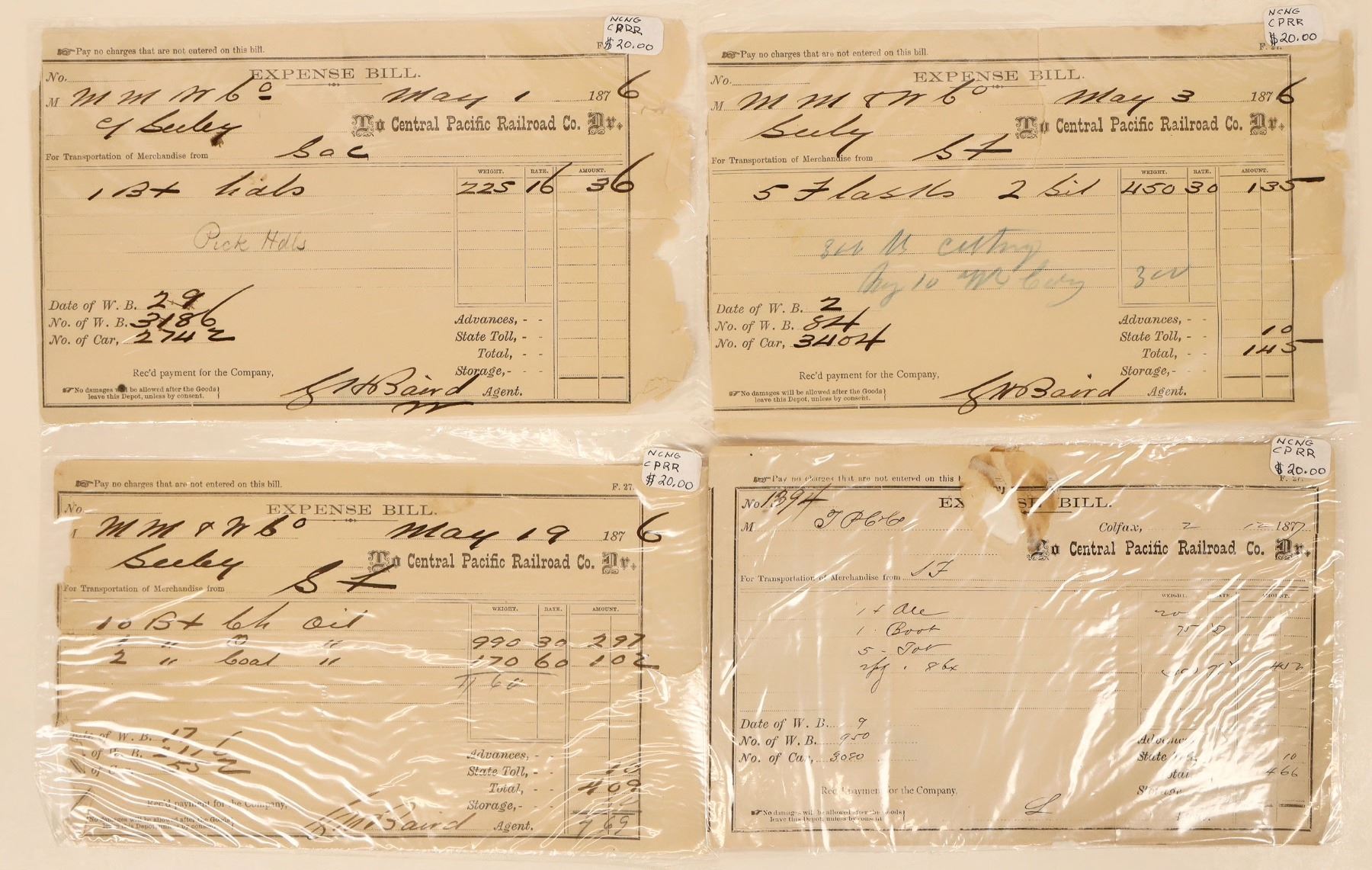 Lot of 4. Four freight expense bill for Central Pacific RR . Three are dated May 1876. One is dated Feb 1877 and has Colfax origination. Varying cond. One has a tear top center, others have some ragged edges.