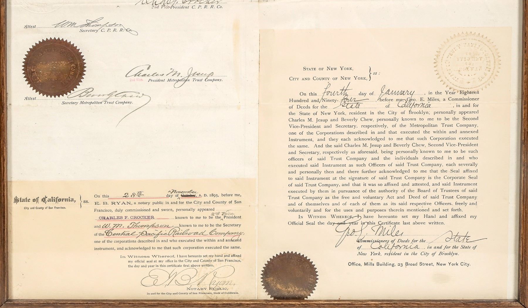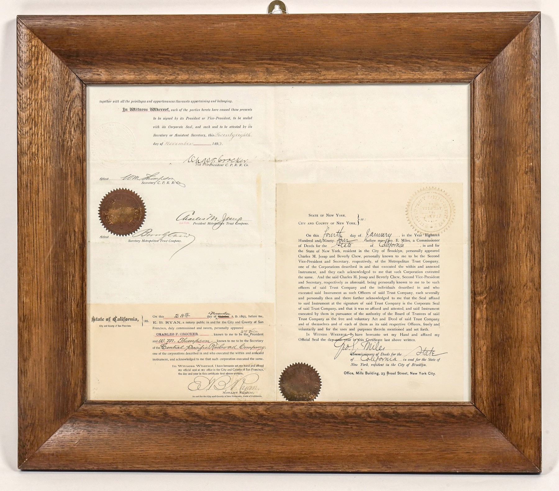 An 1894 land dee issued to The Central Pacific Railroad and signed by Charles F. Crocker, son of Central Pacific founder and president Charles Crocker (1822-1888). Signatures and dates are sharp. The piece is matted and framed. Please see photos for more details.