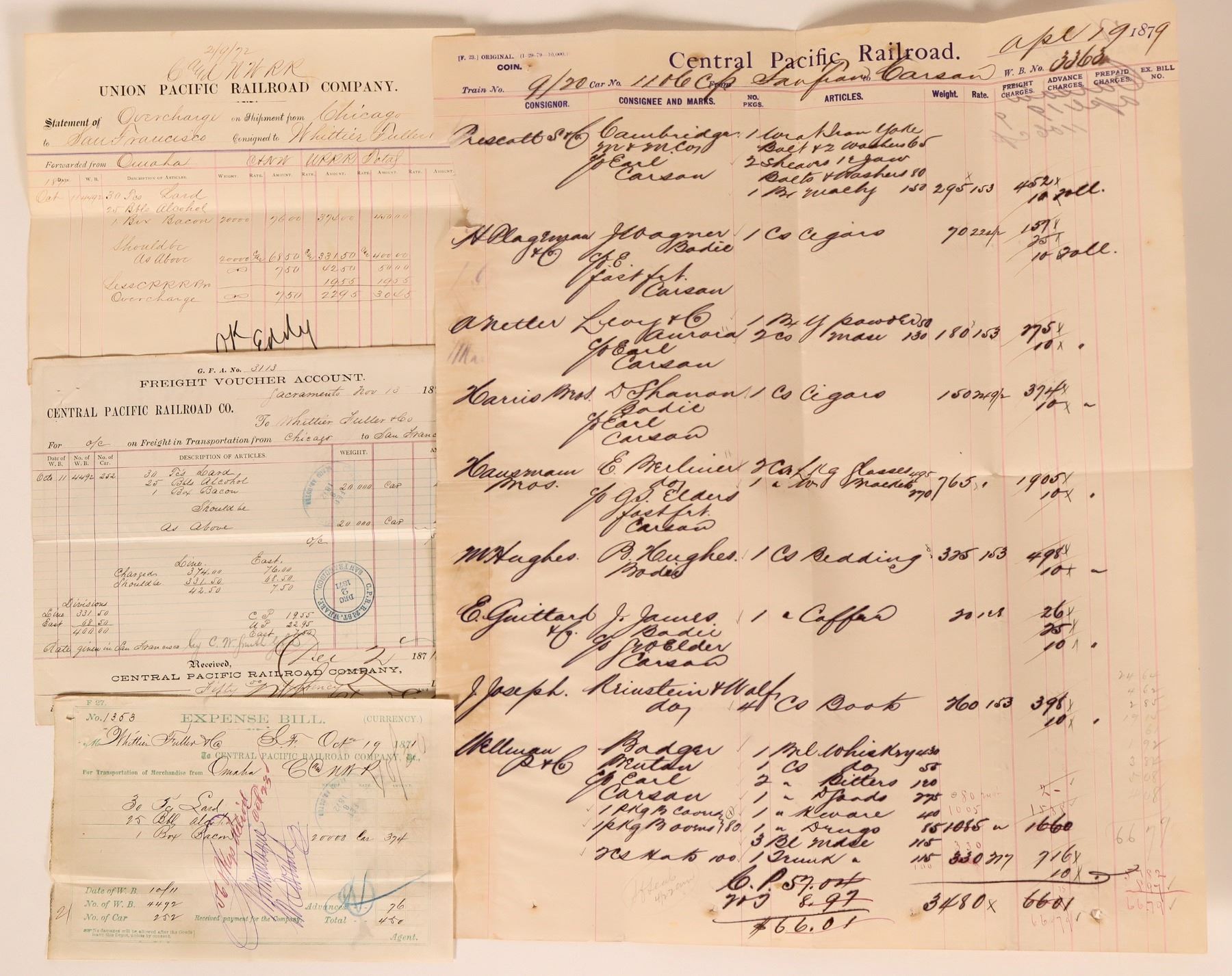 Lot of 4. 1) Large way-bill for items shipped from San Francisco to Carson City, Nevada, 1879. Many items marked for eventual delivery to Bodie, California, including cigars, coffee, and bedding. 2) 1871 Expense Bill for Whittier Fuller & Co. of SF, shipping lard, alcohol, and bacon from Omaha. 3) Freight Voucher Account receipt, 1871, for Whittier Fuller & Co. of SF shipping items from Chicago to SF. 4) 1872 Union Pacific Railroad Company receipt for overcharge on shipment from Chicago to San Francisco for Whittier Fuller & Co.