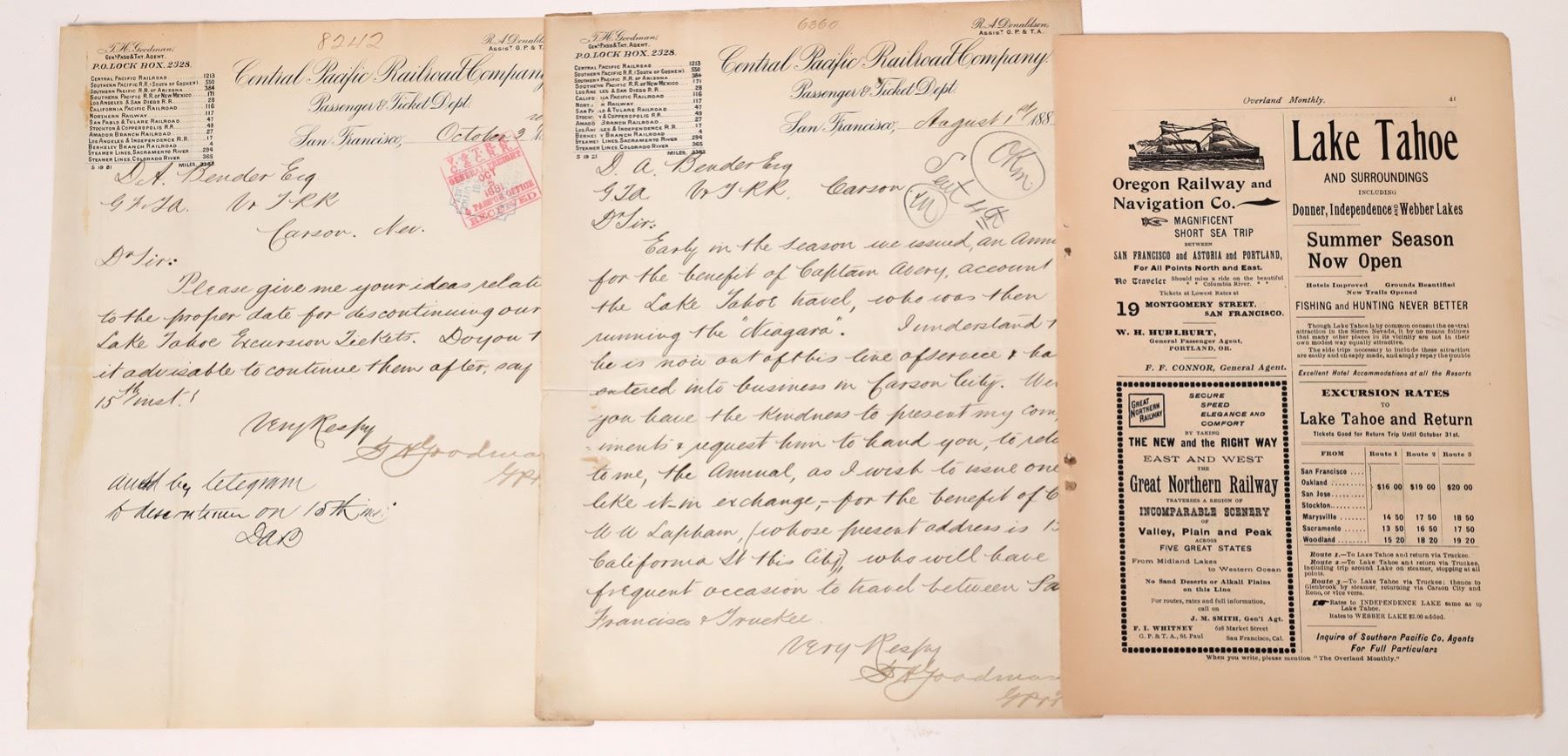 Lot of 3. Two letters and one magazine advertisement. 1) 1881 letter on Central Pacific Railroad Co. letterhead sent to DA Bender, ticket agent for the Virginia & Truckee Railroad. Message says that they want the railroad pass back from Captain Avery, who used to operate the steamer "Niagara" on Lake Tahoe, but has now gone into business in Carson. They now need his pass for Captain Lapham. 2) 1881 letter on Central Pacific Railroad Co. letterhead sent to DA Bender, ticket agent for the Virginia & Truckee Railroad. Message asks when they should discontinue Lake Tahoe Excursion tickets. This was before the railroad had been built from Truckee to Tahoe City, so they are referring to trains going into Truckee (and then stagecoach to Tahoe). 3) July 1895 Overland Monthly ad for the Southern Pacific Railroad Summer Season rates for travel to Lake Tahoe. 10 x 7"