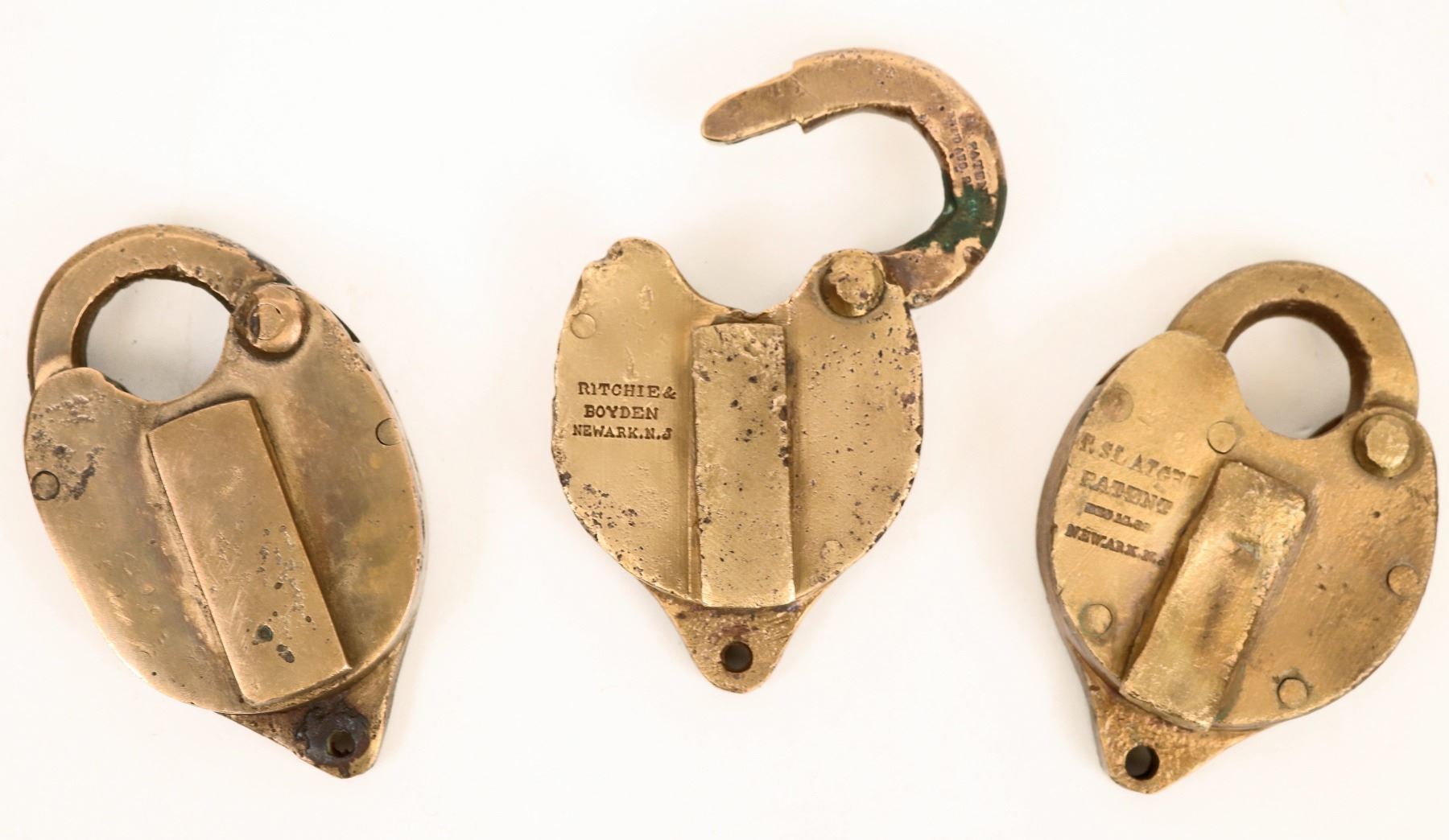 A collection of three robust, heart shaped brass locks from the Central Pacific Railroad Company. The locks each have the text 'C.P.R.R.' stamped on the vertical back plate, with additional identifying text varying from lock to lock: "CPRR, CPRR/ Cal.; CPRR Cal/C. Two of the locks are also stamped with the names of their manufacturers, Ritchie & Boyden of Newark, NJ and T. Slatch of Newark, NJ. One of the locks is in working order, with the other two stuck or dented. No keys included. This lot is by far one of the finest sets of early California Railroad locks ever offered. The CPRR of Cal (California) is rare enough - but to have all three varieties is impossible, yet here it is. circa 1868-1875.