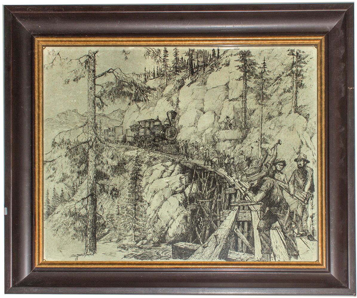 A magnificent 19” by 16” ink line drawing of men building a railroad trestle along a mountainside. In the rear of the drawing is a “2” steam engine inscribed “CPRR”. The lower left of the drawing is signed, “STEPHEN MIRICA/ ©/ 5M/ AM”. Information on the artist is unavailable. This impressive drawing is framed in an ornate 32” by 28” wooden frame with metallic leaf or paint detailing. The railroad indicated in the drawing may be the Central Pacific Railroad formed as part of the Transcontinental Railroad, which was begun in 1863. The name changed to Southern Pacific in 1885, and the whole line is now owned by Union Pacific. This drawing commemorates the construction of the most historic and exciting railroad in the United States—a treasure for any collection.City: County: State: CADate: