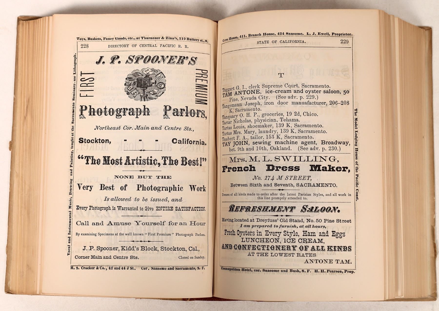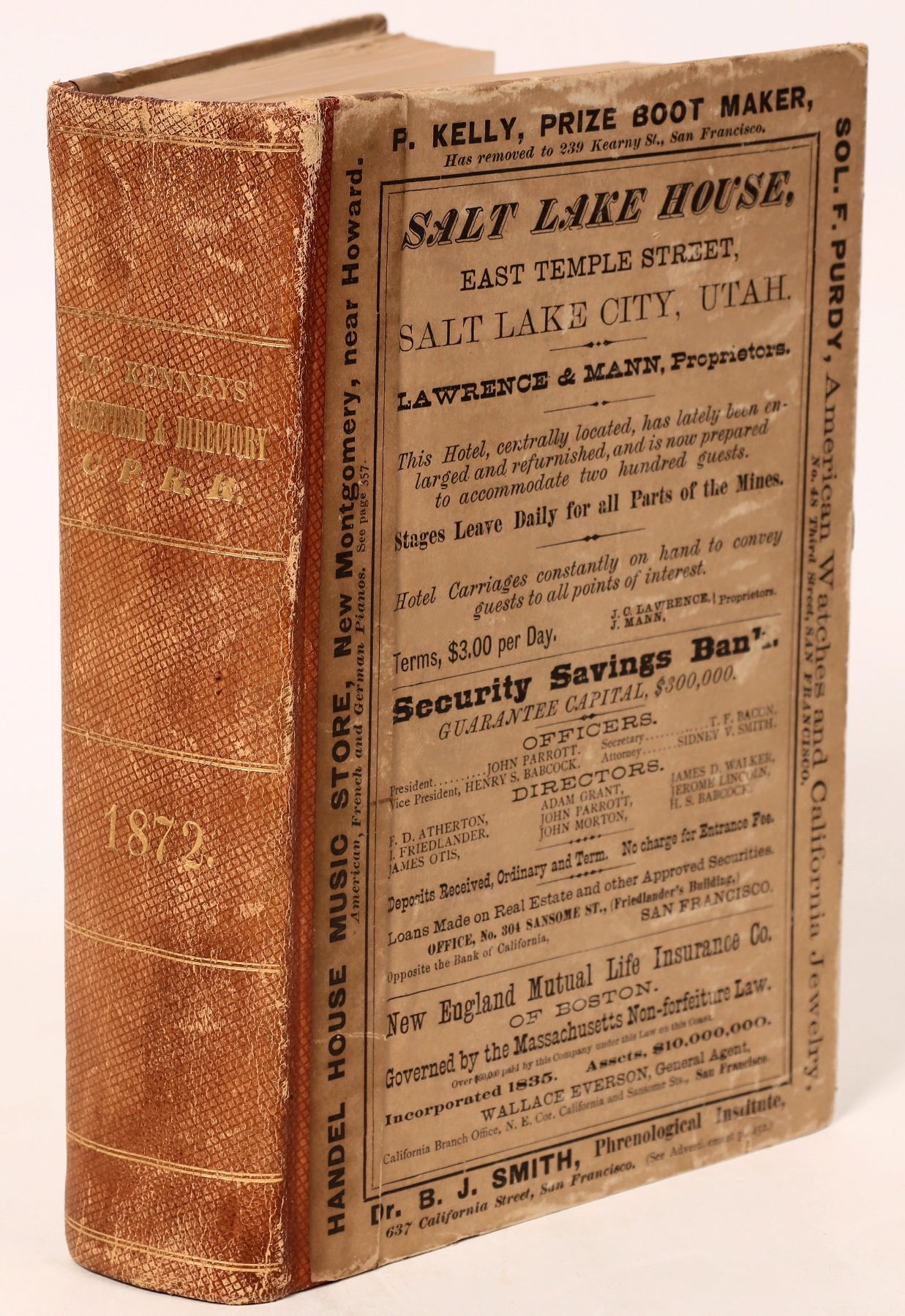 McKenney's Gazetteer and Directory of the Central Pacific Railroad and its branches for 1872: A guide and business directory complete in one volume. Consisting of the names of business firms, their occupation and location; introducing a description of each place, showing its prominence, leading features, surroundings, etc. 1872. McKenney, L.M., compiler. Sacramento, Directory Publishing Company. xxxviii, 703 pp. Numerous advertisements, most included in the pagination including those at front and rear; 4-page insert for Heald's Business College; engraved plate of the Sacramento Seminary. 8.5x5.5, original leather-backed printed boards, spine lettered in gilt. Very uncommon directory covering the western portion of the areas served by the recently completed transcontinental railroad, with "Business directories of Central Pacific Railroad cities and towns in California, Nevada, Oregon and Utah; business directory of San Francisco; classified business directory in all four states." Quebedeaux further notes that there are descriptions of the cities and towns on the Central Pacific Railroad line and its branches and calls it the "First major California railroad directory; first Central Pacific directory of its portion of the transcontinental line." Provenance: Descended in the family of Nevada City dentist, and orchardist, A. Chapman, whose full-page advertisement appears on p.39. Quebedeaux 139 locates 5 copies in institutional libraries, and OCLC located 4 copies, 3 of them different. Just light shelf wear; a few pages with offsetting from ferns that had been pressed, still fine and fresh. A very fine copy.
