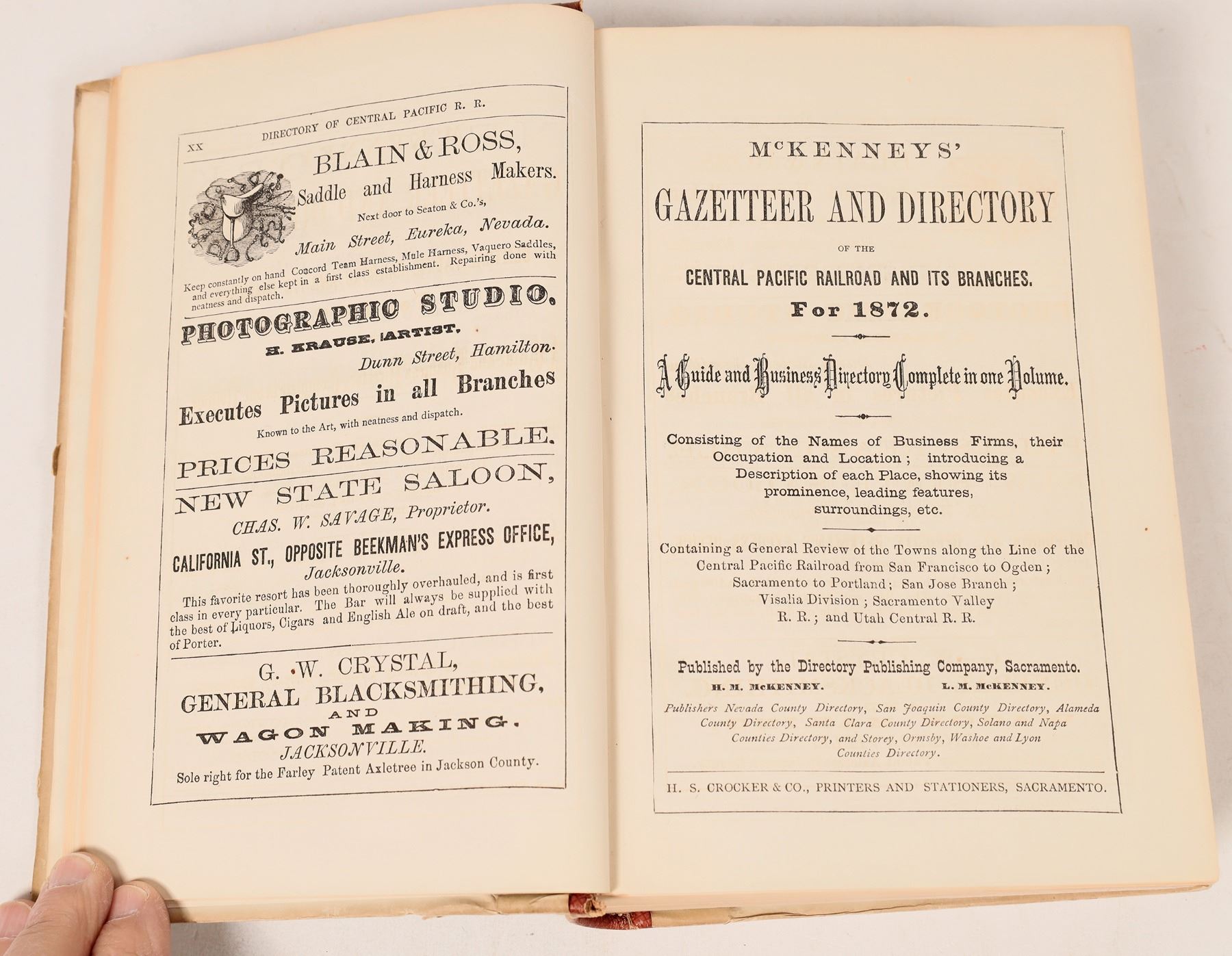 McKenney's Gazetteer and Directory of the Central Pacific Railroad and its branches for 1872: A guide and business directory complete in one volume. Consisting of the names of business firms, their occupation and location; introducing a description of each place, showing its prominence, leading features, surroundings, etc. 1872. McKenney, L.M., compiler. Sacramento, Directory Publishing Company. xxxviii, 703 pp. Numerous advertisements, most included in the pagination including those at front and rear; 4-page insert for Heald's Business College; engraved plate of the Sacramento Seminary. 8.5x5.5, original leather-backed printed boards, spine lettered in gilt. Very uncommon directory covering the western portion of the areas served by the recently completed transcontinental railroad, with "Business directories of Central Pacific Railroad cities and towns in California, Nevada, Oregon and Utah; business directory of San Francisco; classified business directory in all four states." Quebedeaux further notes that there are descriptions of the cities and towns on the Central Pacific Railroad line and its branches and calls it the "First major California railroad directory; first Central Pacific directory of its portion of the transcontinental line." Provenance: Descended in the family of Nevada City dentist, and orchardist, A. Chapman, whose full-page advertisement appears on p.39. Quebedeaux 139 locates 5 copies in institutional libraries, and OCLC located 4 copies, 3 of them different. Just light shelf wear; a few pages with offsetting from ferns that had been pressed, still fine and fresh. A very fine copy. California Franklin Collection