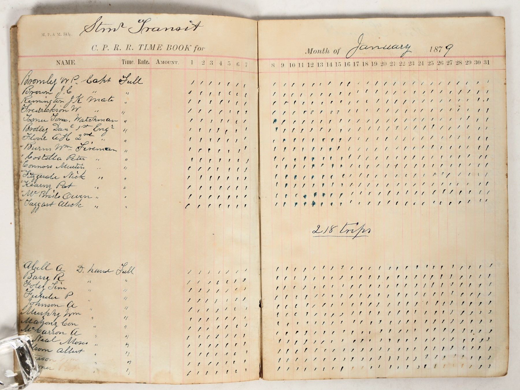 Leather time book for Steamers Transit and Thoroughfare which operated as ferries for the Central Pacific Railroad between San Francisco and Oakland. Entries start in January 1879 and end in August 1880. The first entries are for the Steamer Transit and then it shifts to Steamer Thoroughfare. Crews are two dozen people. Lists number of trips done per month. About 40pp. 7.5 x 5"