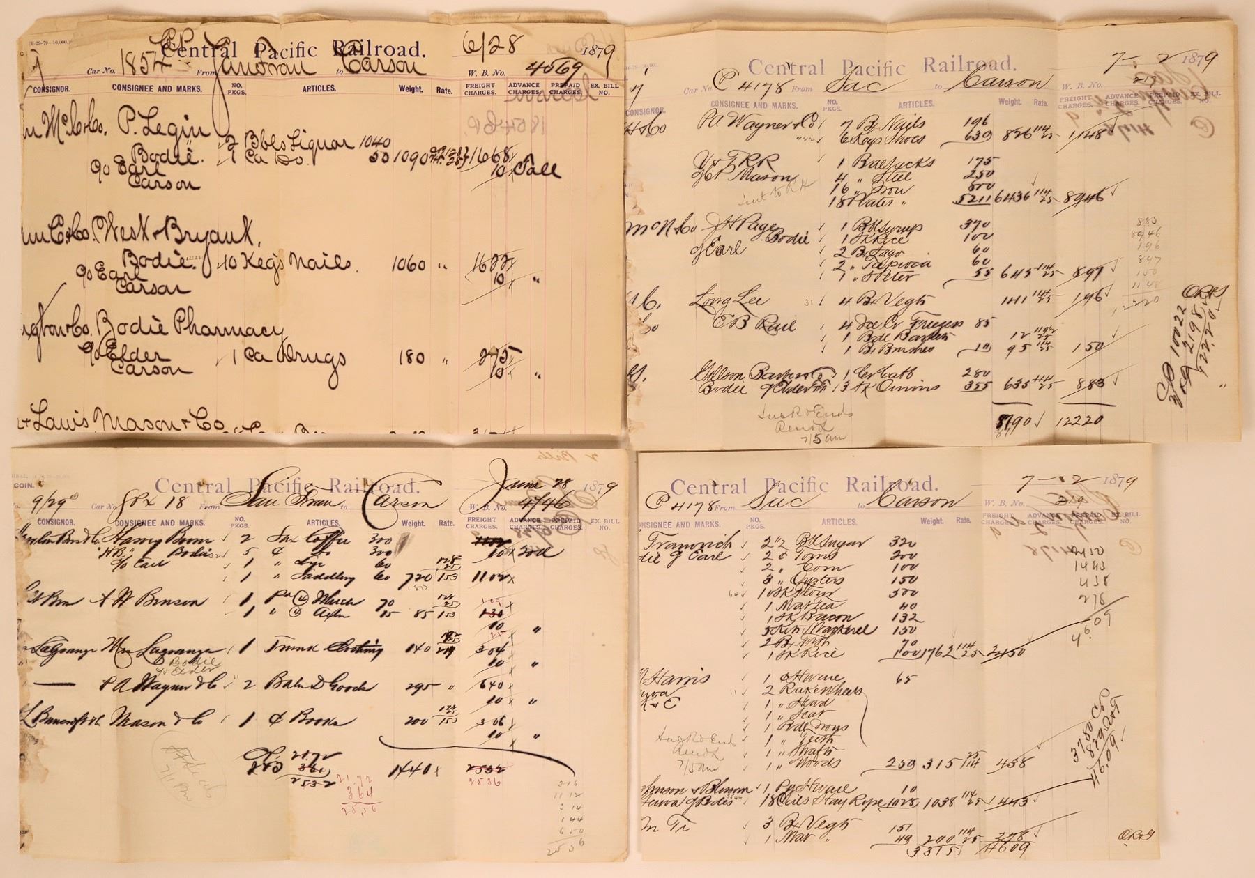 Lot of 8 way-bills for items shipped from Sacramento to Carson (Nevada). Most have at least one consignment listed that is en route to Bodie, California. Bodie merchants include: the Bodie Pharmacy (one case drugs); Chinese merchants Tong Sung and Hong King; Gilson, Barber & Co.; JH Page; Harvey Boone; Mrs. Lagrange; West & Bryant; and P. Legin. Cut on the left border (probably from being removed from a book).