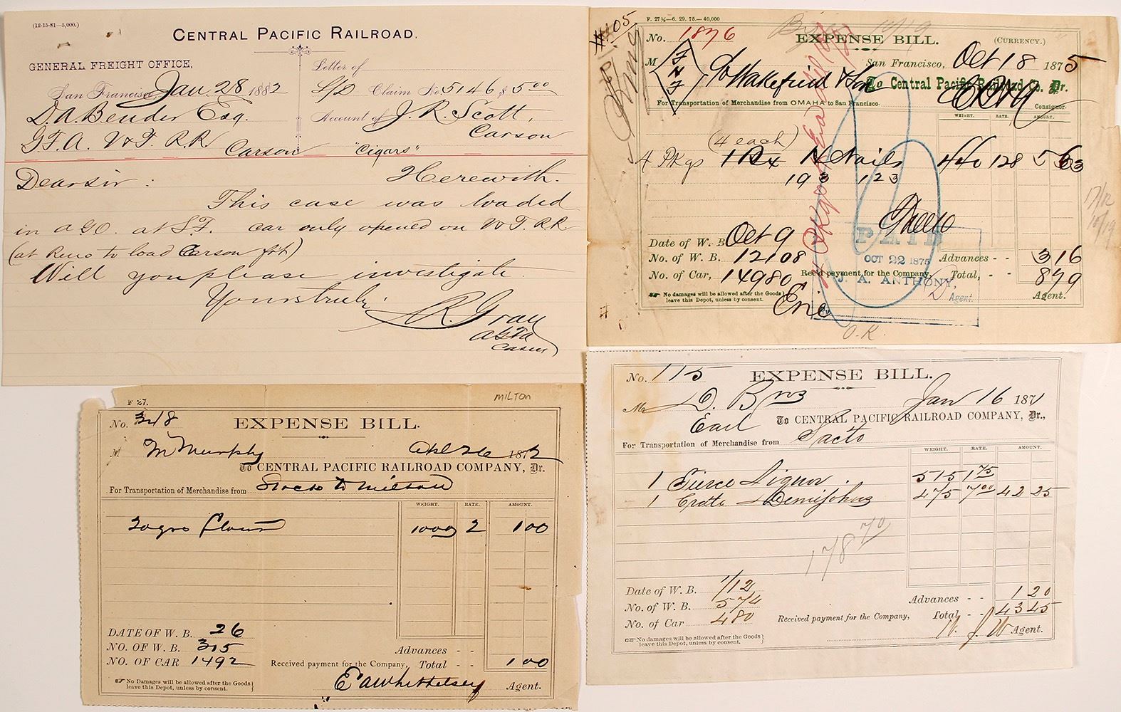 Lot of 4. Three expense bills: 1872, package from Sacramento to Milton; 1875, San Francisco; and 1871, Sacramento. Plus an 1882 memo from the General Freight Office in San Francisco to DA Bender in Carson regarding shipment of cigars for JR Scott. HWAC# 60006 Date: 1871-1882 Location: California