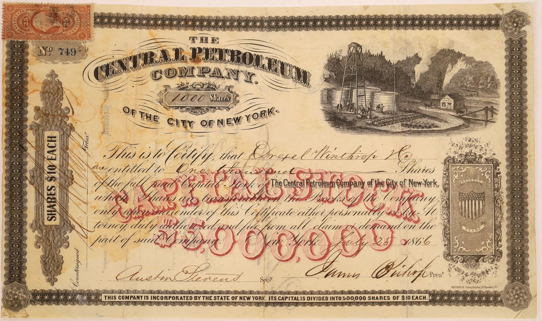 # 749 for 1,000 shares to Drexel Winthrop& Company on July 25, 1866. Signed by president James Bishop and secretary Austin Stevens. Vignette of two oil rigs with surrounding view of field and hills. 25c revenue stamp. Under print Capital Stock $5,000,000. Printed by Hatch & Company of New York. Discoloration though out. We did not find the exact location doing a quick search. This is a great opportunity for someone to discover this story! State:New York City: Date:1866 Provenance: