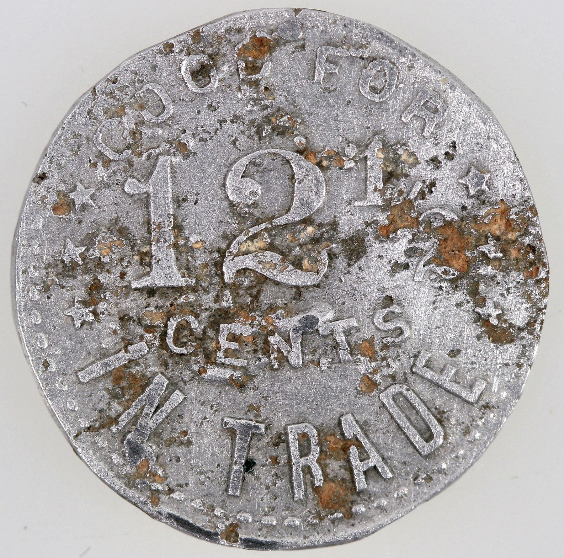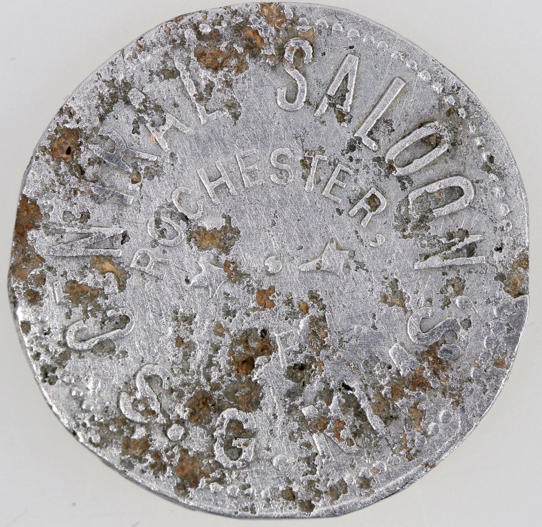 From the Pershing County ghost town: CENTRAL SALOON / ROCHESTER, / NEV. / S.G. NIMS, // GOOD FOR / 121/2 / CENTS / IN TRADE; Al., rd., 24 mm. Some environmental damage, but awfully rare!
