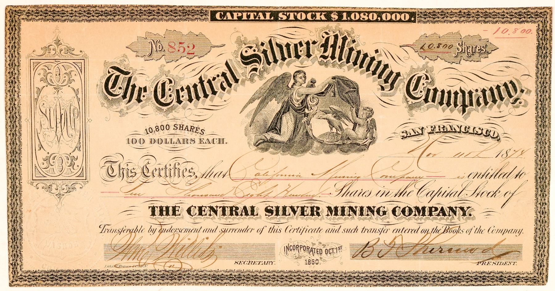 This stock has a ton of Comstock history embedded in it. Inc. Oct, 1st, 1860. No. 852, issued for all 10,800 shares of the company to the California Mining Company on Nov. 11th, 1874. Signed by B.F. Sherwood as president and secretary Willis. Not cancelled. Black border and print. Allegorical vignette. Printed by GT Brown & Co., SF (noted African-American lithographer). Pinholes, folds, heavy toning. Borders trimmed tight. 4.75 x 9" This stock represents the consolidation of the Central Mine with the California Mine as part of a project to better access the recent Big Bonanza discovery. The California Mining Company had just been formed earlier that year to explore the portion of the Bonanza ores on the California property (the Bonanza discovery had been in the adjacent Con. Virginia). Therefore, after this stock was issued, the California Mine was now composed of the Central No. 1 and 2, the original California claim, and the Kinney claim. The Central Mine had been staked in 1859 by John Bishop, one of the early Comstock locators. This stock is also signed by B.F. Sherwood. He was one of the original incorporators for the Gould & Curry mine. He was one of the Comstock mining superintendents who asked Senator William Stewart and Senator James Nye to defeat the Sutro Tunnel project in 1868. (The issue was about whether the successors of the mining companies Sutro had originally gone into contract with would be forever bound to the royalties in the contract and that Sutro had to keep to his original date of completion. Stewart was worried that otherwise Sutro could keep extending the construction and thus his royalty contracts.) Sherwood was one of the people made a millionaire by the Comstock. The California Mining Co. (after absorbing the Central) become the second biggest producer. [Ref: Ansari] () Ken Prag Collection