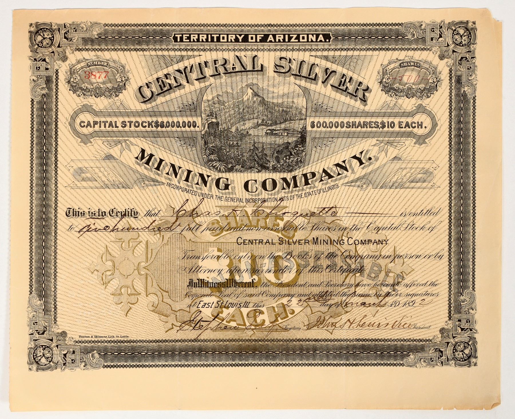 Territory of Arizona. No. 3877, issued for 500 shares in 1892. Signed by the vice president and secretary. Not cancelled. Vignette of mountain with train. Underprint RN facsimile design. 9.5 x 11.5" Pinholes, folds, tears along edges, corner missing. This company operated the Central mine some 40 miles southeast of Tucson, Pima County. Scarce.