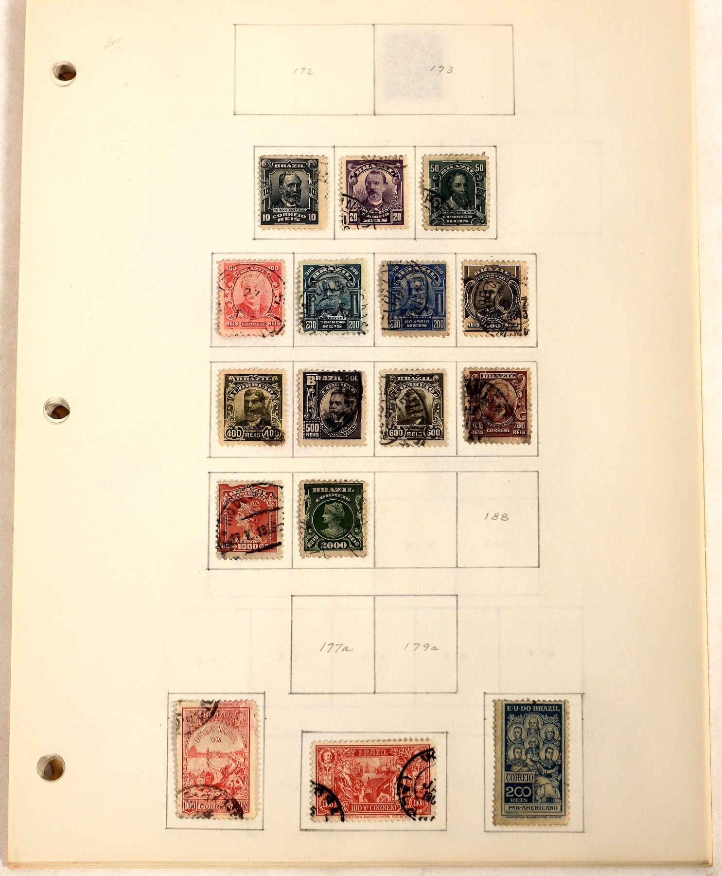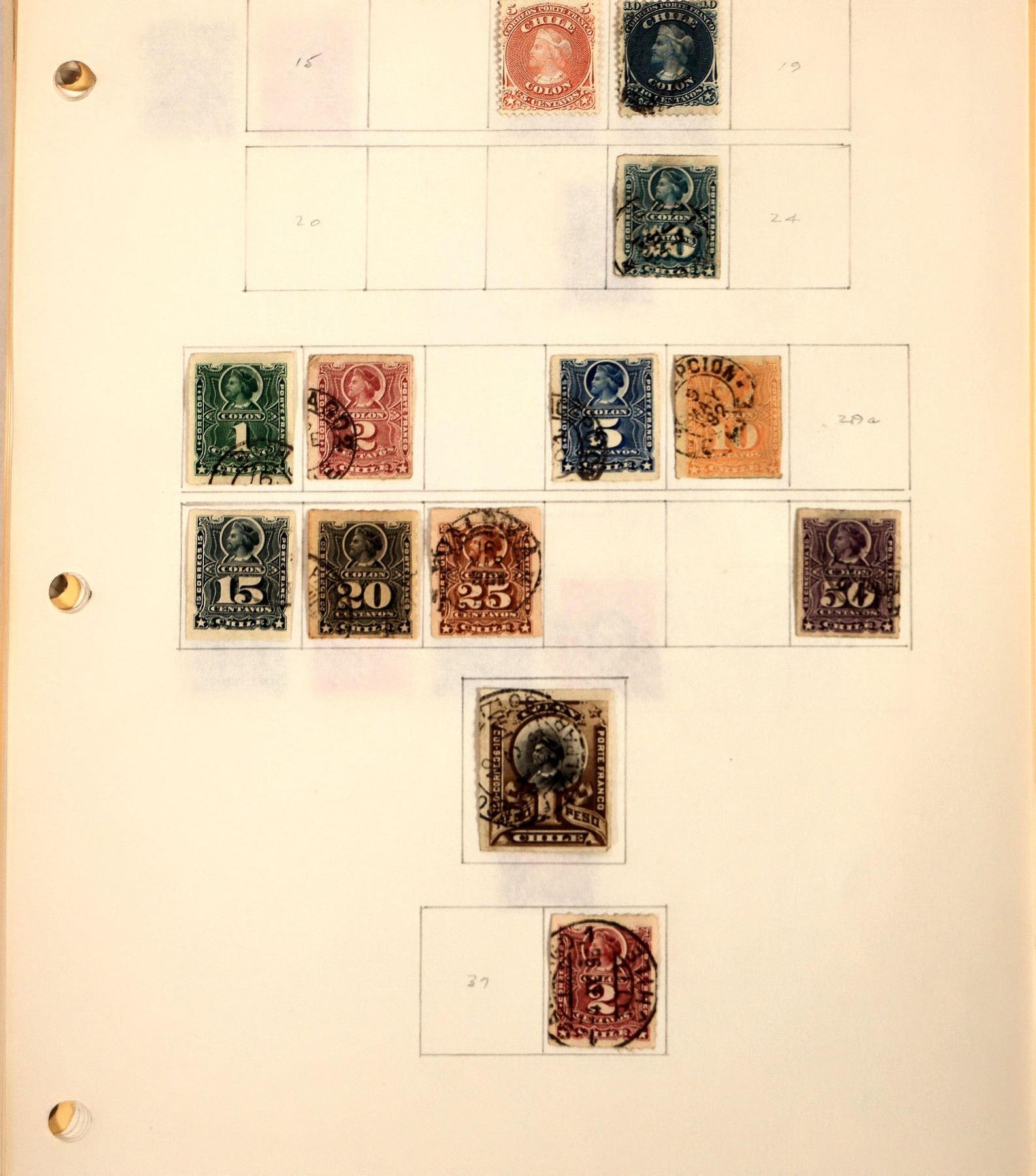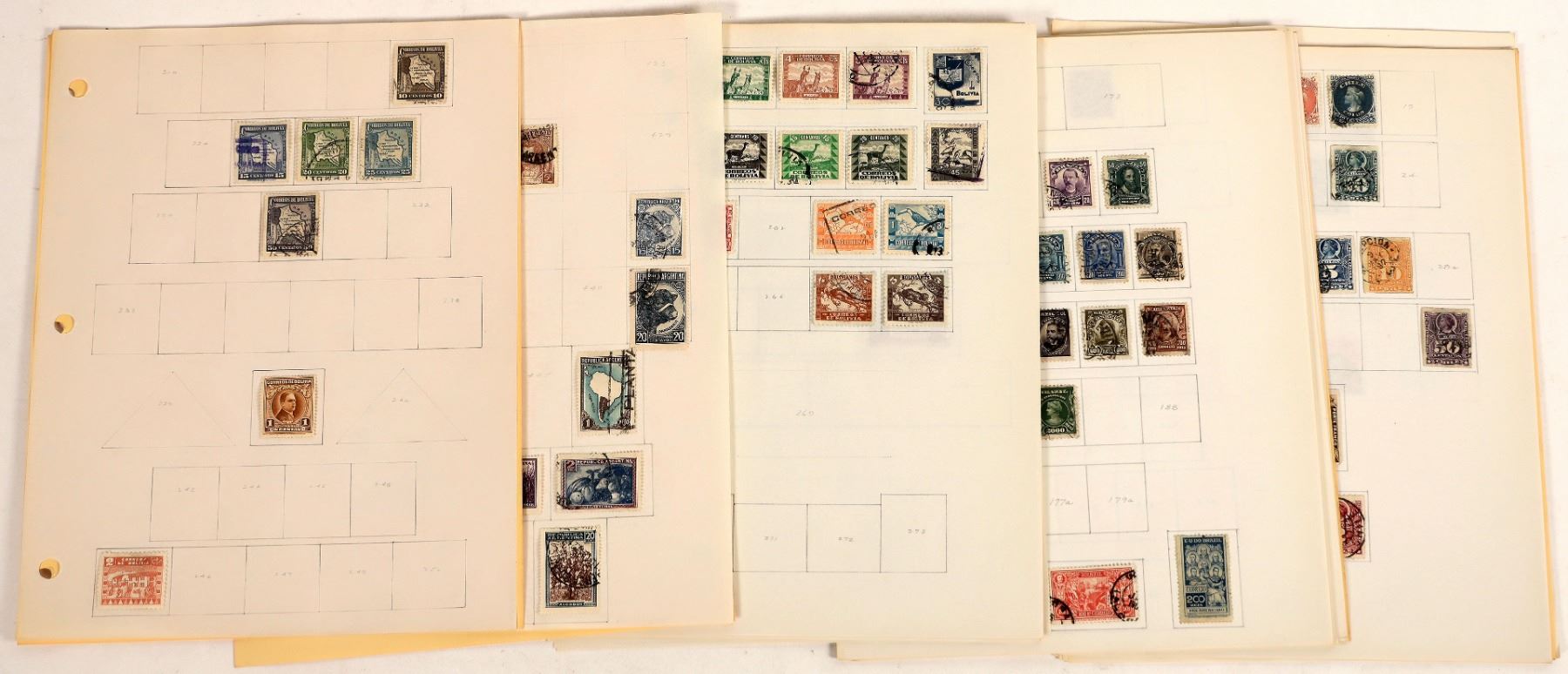 Multiple album pages from central and south American countries. List includes Argentina, Bolivia, Brazil, Chile, Columbia, and Mexico. Dates are not typically indicated, denominations are listed but in home country currency. Pages are not filled, but have anywhere from (1) to (14) stamps each. Stamps are typically cancelled.