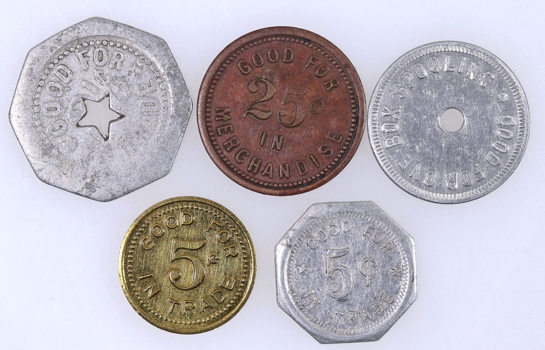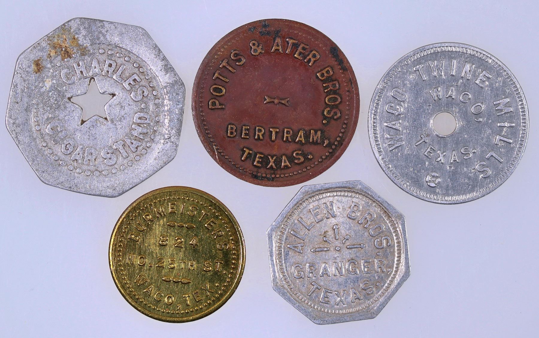 Lot of five tokens from Texas: 1) Bertram: Potts & Ater Bros.; 2) Granger: Allen Bros.; 3) Waco: Waco Twine Mills; 4) Waco: Bermeisters; 5) Waco: St. Charles Cigar Stand.