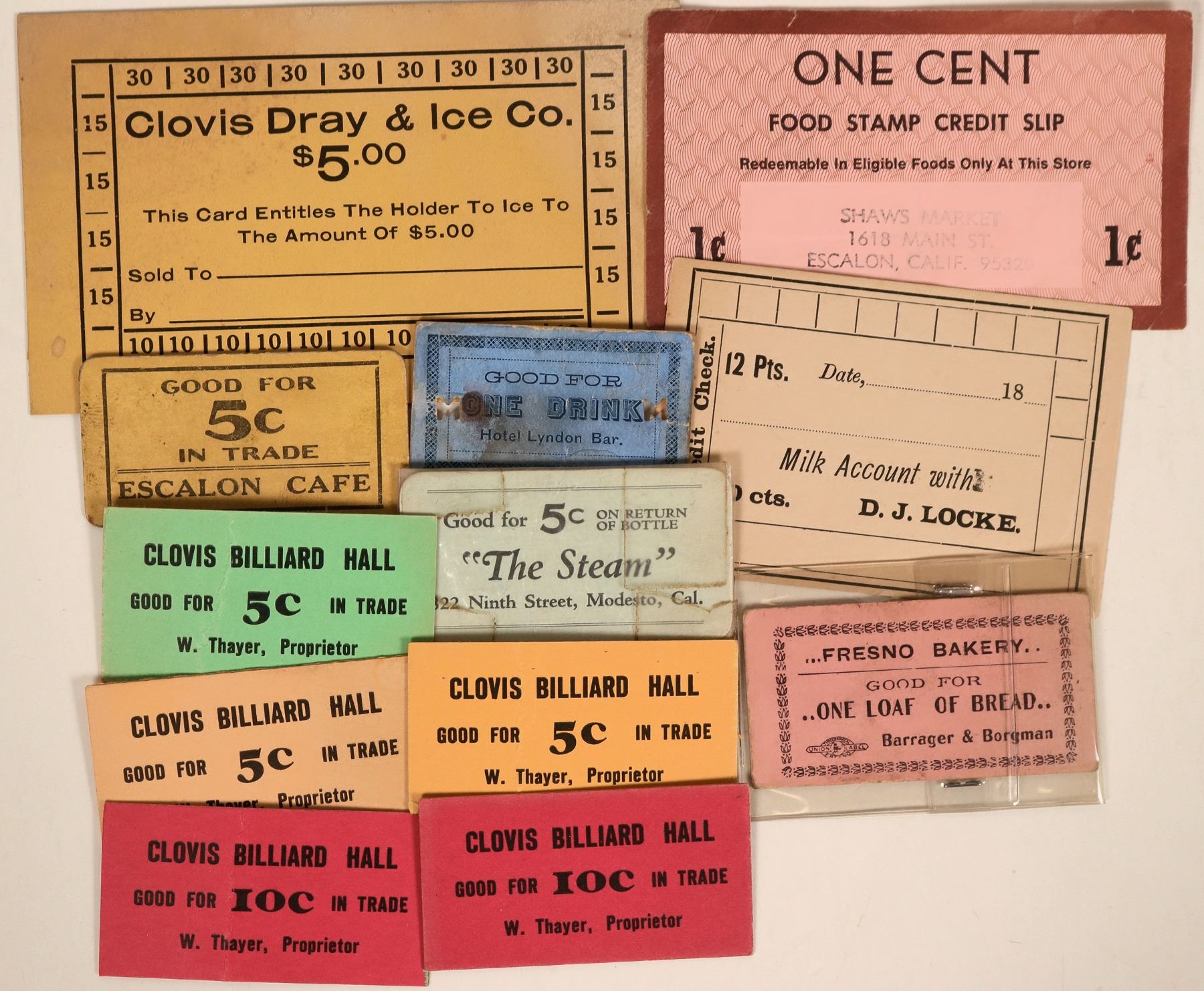 Lot of 12 good for cardboard tokens from: Fresno, Clovis, Lockeford, Escalon, Modesto, and Lyndon. Ex.: Ron Lerch Collection.